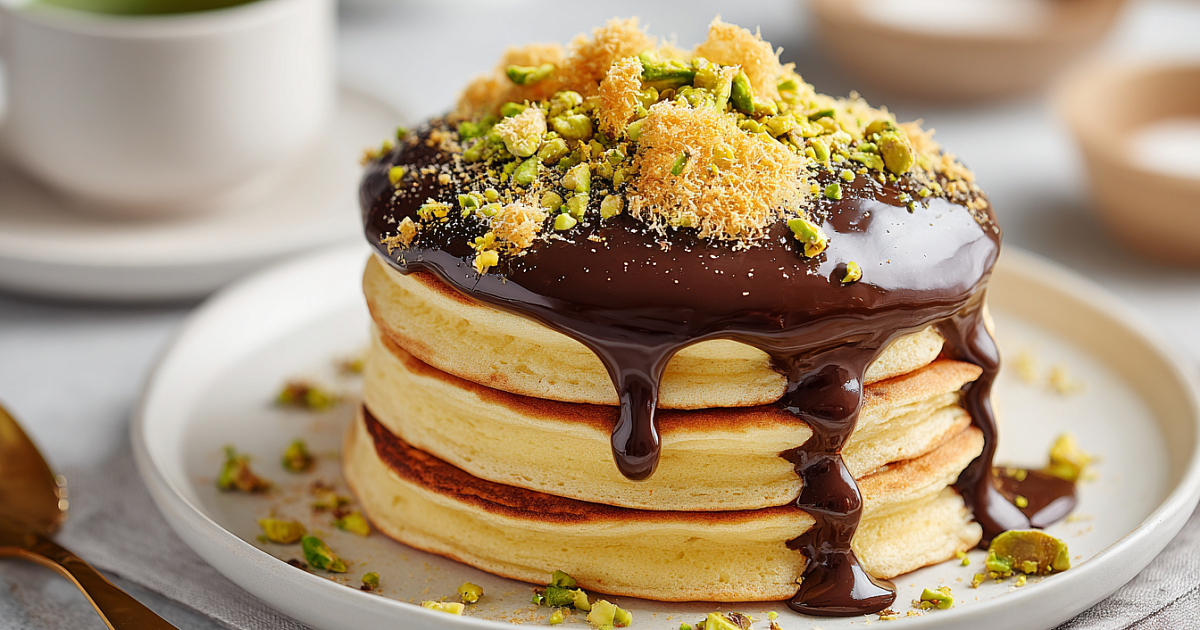 Лайфхак: для начинки в стиле дубайского шоколада обжарьте 10 г теста катаифи на сливочном масле до хруста, смешайте с 5 г кунжутной и 30 г фисташковой пасты. Ганаш: 50 г молочного шоколада залейте 40 мл горячих сливок.