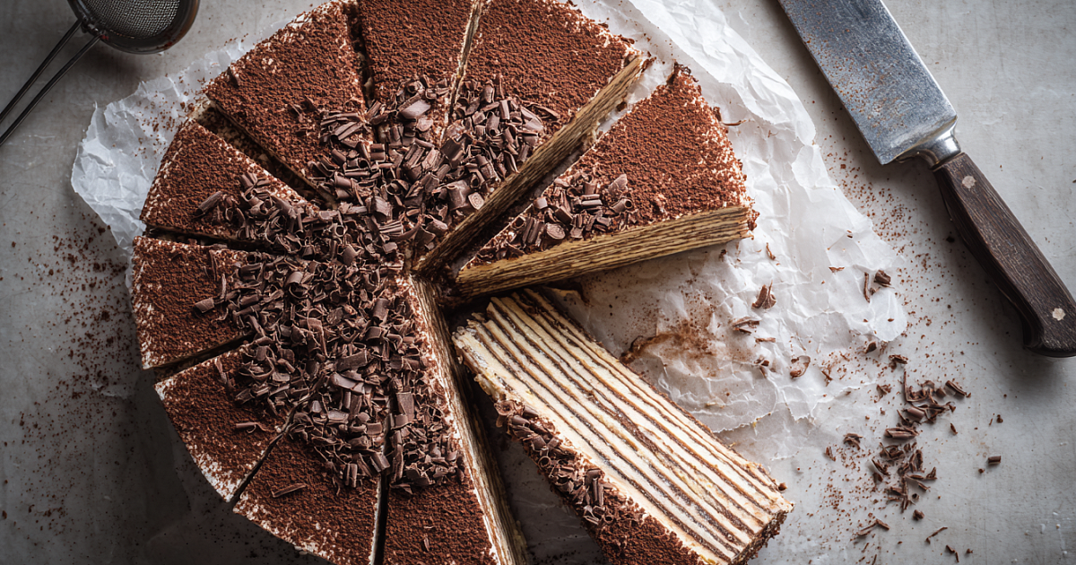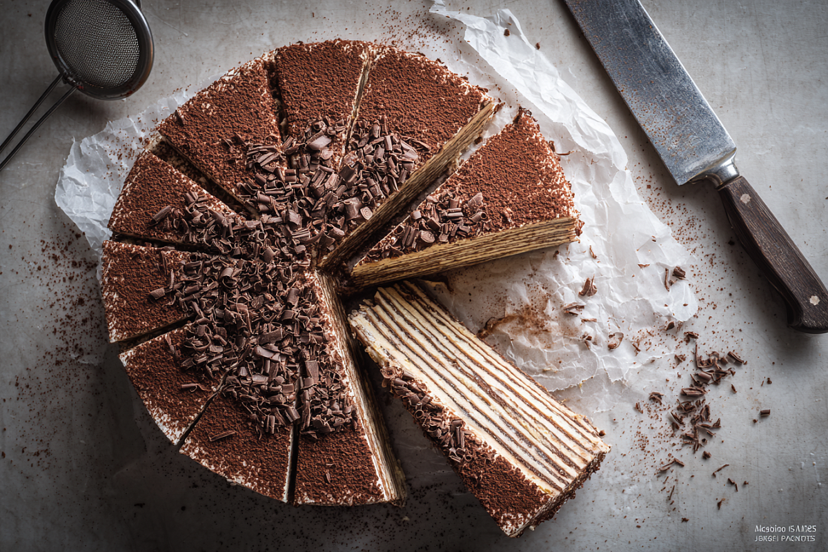 На каждый корж — примерно 2 ст. л. крема, распределяем тонким слоем. Следующий корж слегка прижимаем: важна плотная «склейка» слоёв (как у «Наполеона»). Верх украшаем стружкой шоколада и лёгкой вуалью какао. Оставляем для пропитки: при комнатной температуре или в холодильнике. Оптимально — ночь; за сутки вкус становится глубже, срез — ровнее.