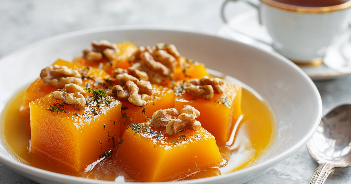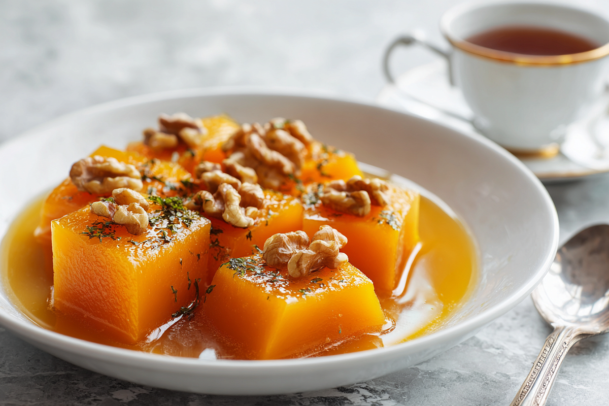 Тыква превращается в нежный десерт с медовым сиропом и хрустом орехов. Готовится просто, а вкус – как из турецкого кафе.