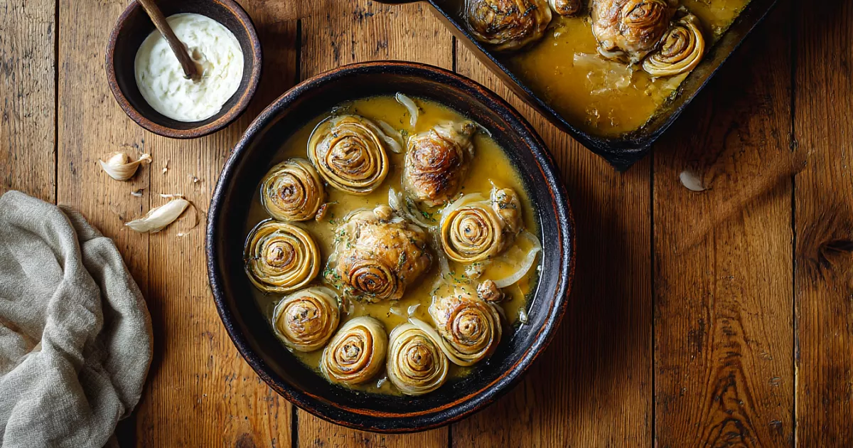 Это один из тех рецептов, к которым возвращаются снова и снова. Когда-то его подавали на праздничный стол ещё в девяностые, пробовали варианты с майонезом и сметаной, кто как выкручивался. Со временем всё лишнее ушло, осталась чистая классика: много сочного лука, немного моркови для красоты, куриные бёдра и простое тесто на кипятке. В итоге получается сытное блюдо, где и мясо, и рулетики, и сам луковый соус съедаются подчистую.
