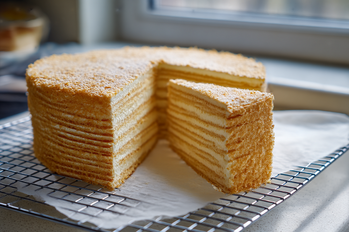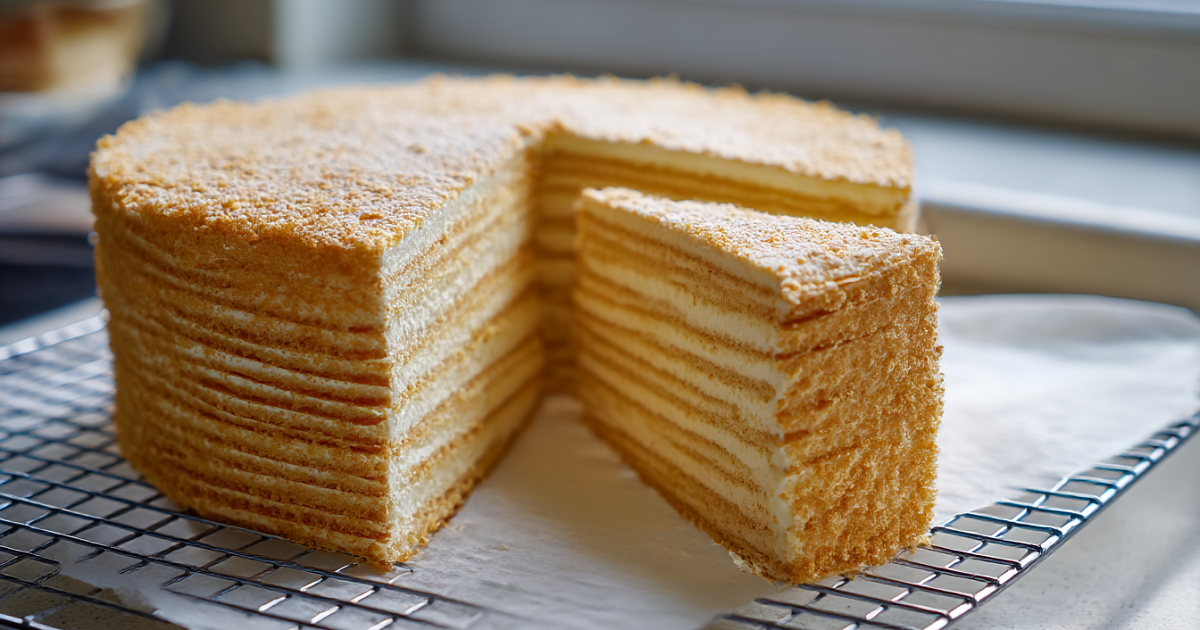 Никакой духовки, только кастрюля с водой и форма, а на выходе – мягкий, гибкий медовый бисквит, прослоенный лёгким кремом. Классический вкус, который почти всегда производит впечатление.