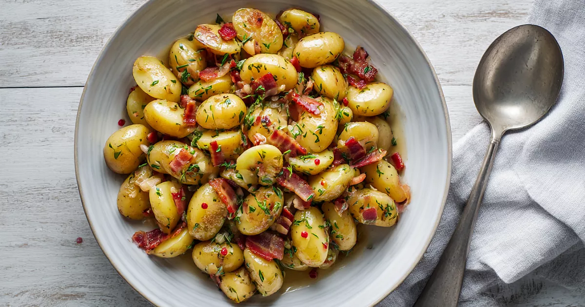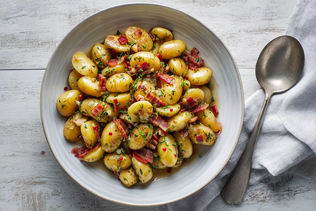 Тёплый картофельный салат с беконом и луково-чесночной заправкой: простой немецкий ужин без лишних хлопот.