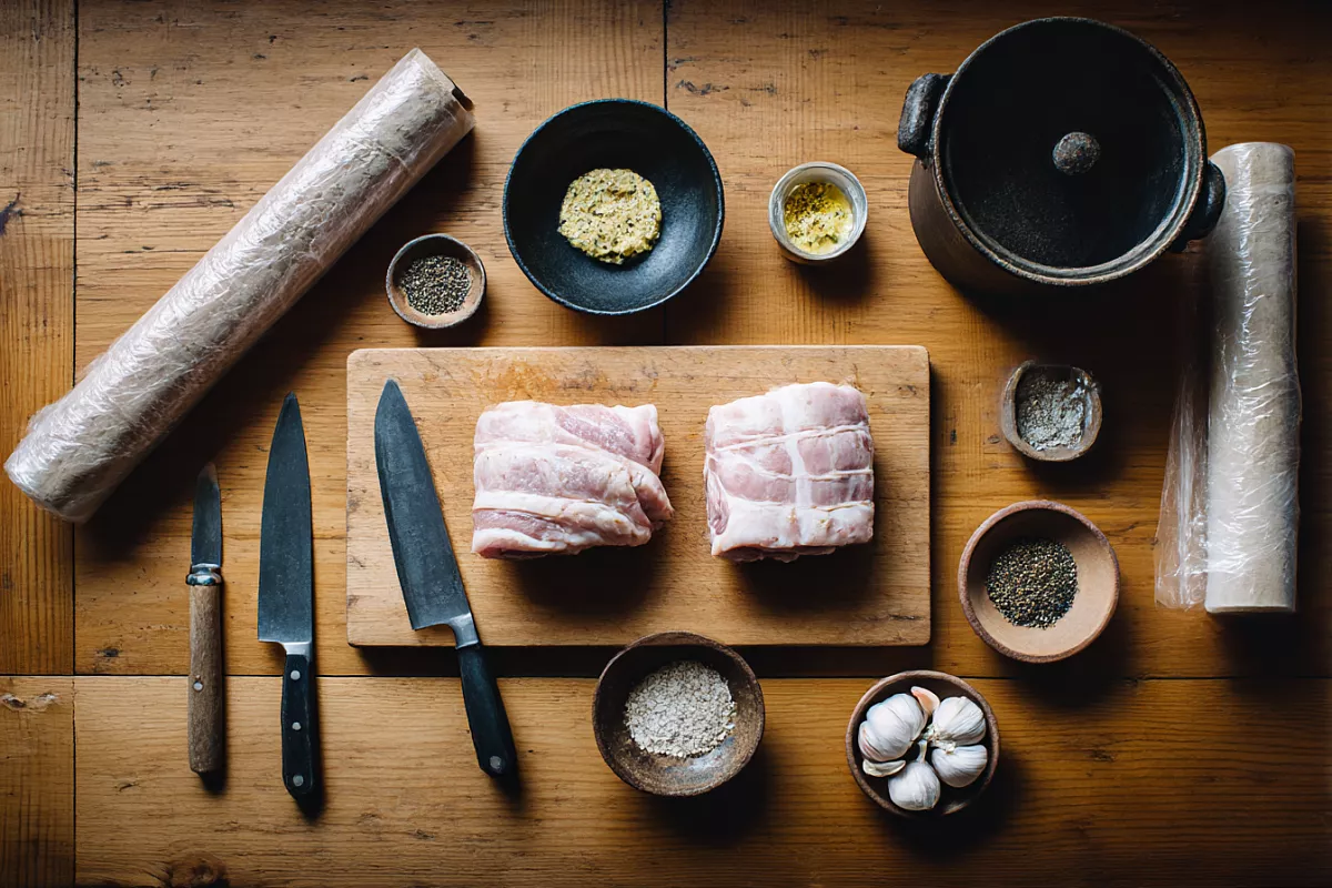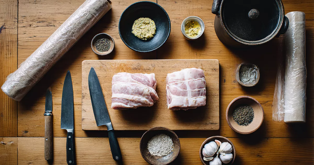 Простая закуска из свиных рулек, которая получается плотной, ароматной и отлично смотрится в тонкой мясной нарезке.