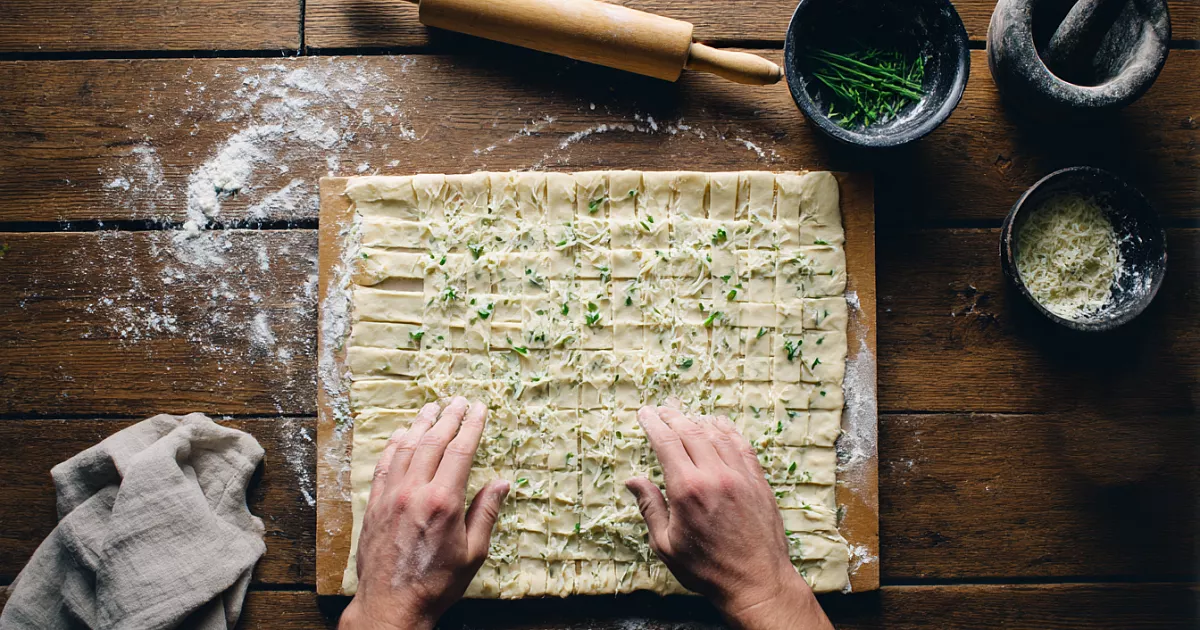 Острым ножом или шпателем сделайте по два надреза с каждой стороны прямоугольника, деля заготовку мысленно на три части и прорезая тесто примерно на треть ширины. Полосы последовательно загибайте к центру и вперёд, каждый раз слегка утрамбовывая начинку, чтобы слои держали форму. В итоге получается аккуратная многослойная конструкция.