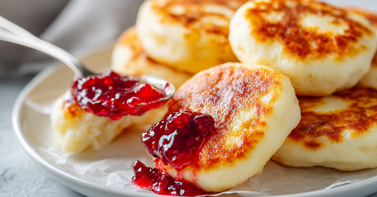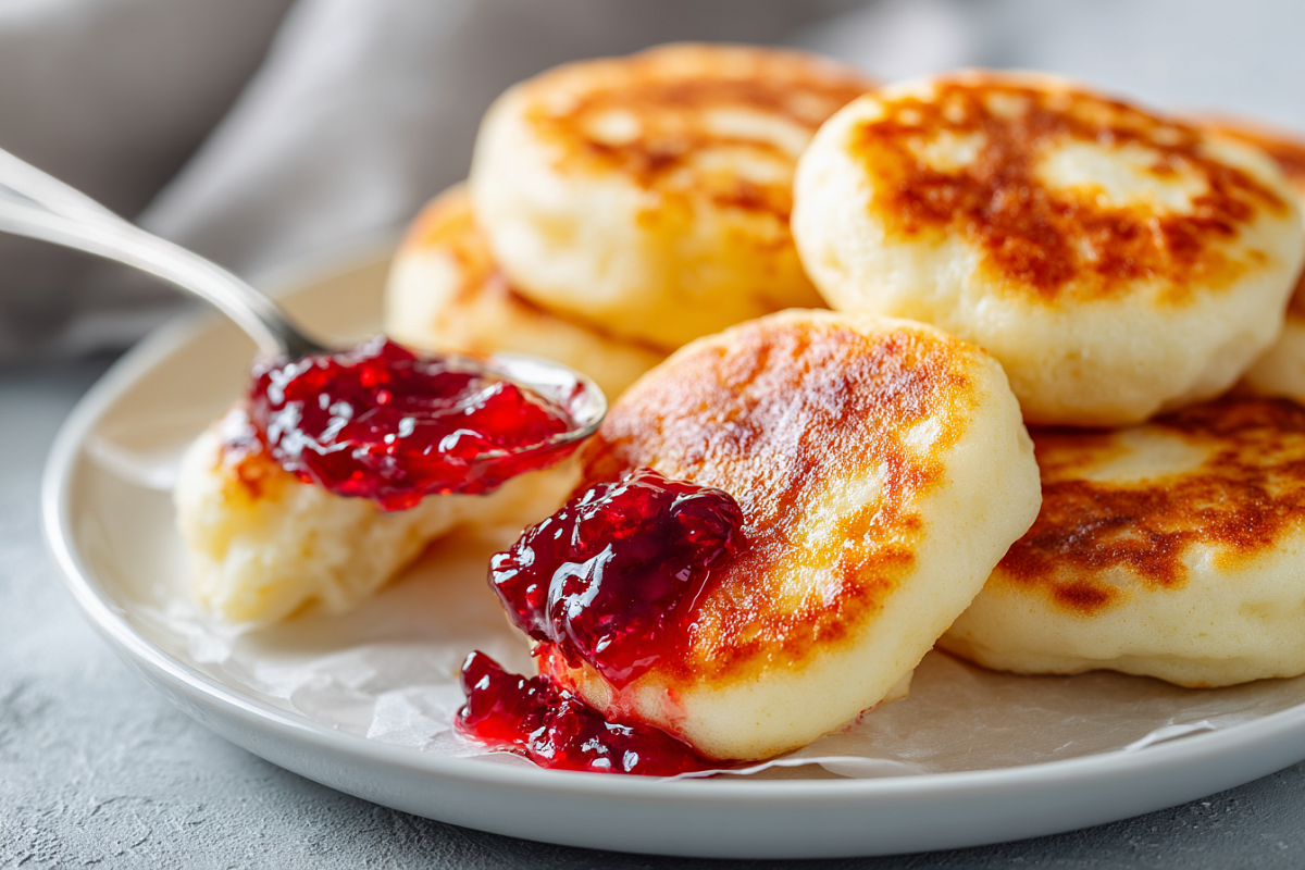 Горячие сырники поливаем брусничным вареньем с минимумом сахара – кислинка идеально балансирует сладость. Подаём сразу – корочка хрустит, середина тает.