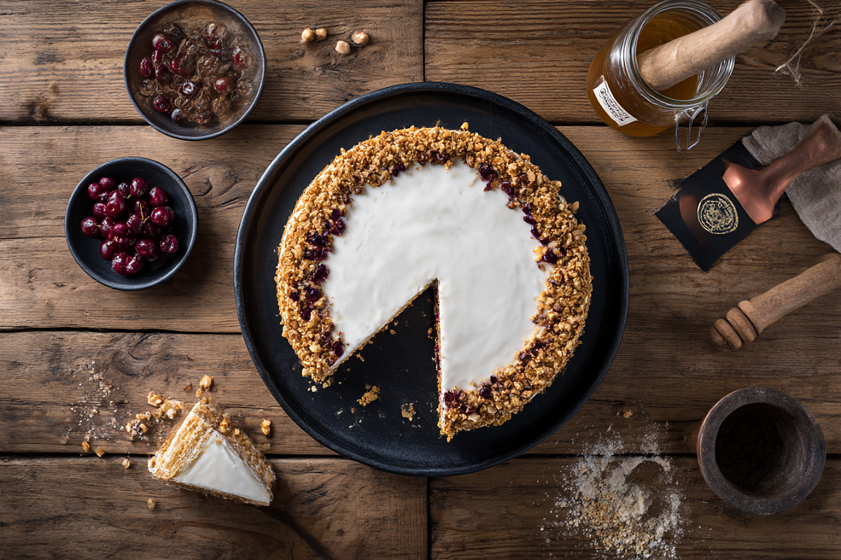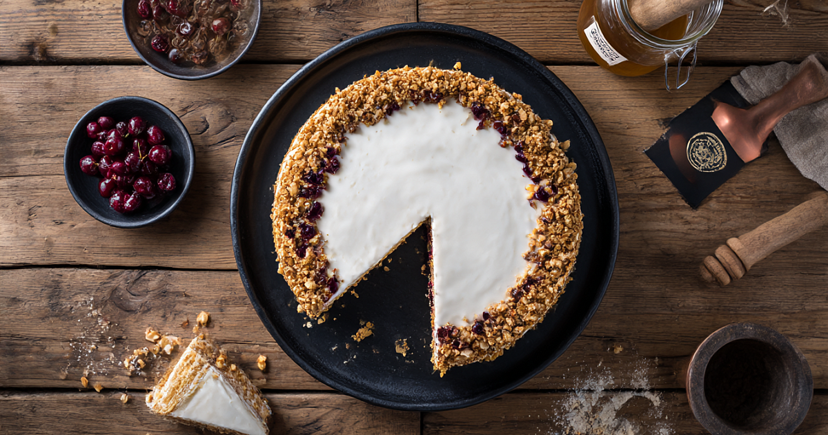 Честно скажу как человек в годах: рецептов медовика много не бывает. Каждый раз вроде бы снова мёд, мука и крем, а торт выходит другим. Здесь бисквит сам по себе медовый, с большим количеством мёда, корж весь в маленьких «точечках» от карамелизированного мёда и пропитывается просто замечательно. Внутри — сметана, мягкий банан и вишня, так что получается уже не простой деревенский медовик, а почти десерт с фруктами, который приятно и к чаю подать, и на праздник.