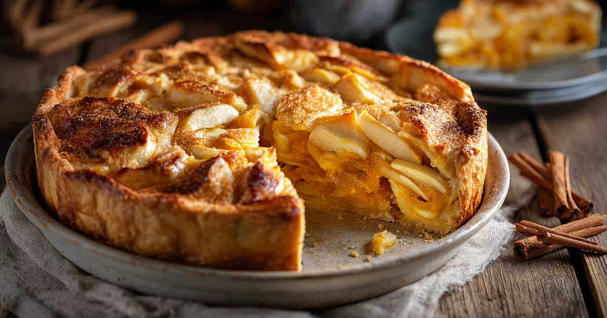 Выливаем 1/3 теста, разравниваем тонким слоем. Выкладываем яблоки внахлёст. Заливаем половиной оставшегося теста. Сверху распределяем тыкву, покрываем тестом. Финальный слой – оставшиеся яблоки. По желанию посыпаем корицей.