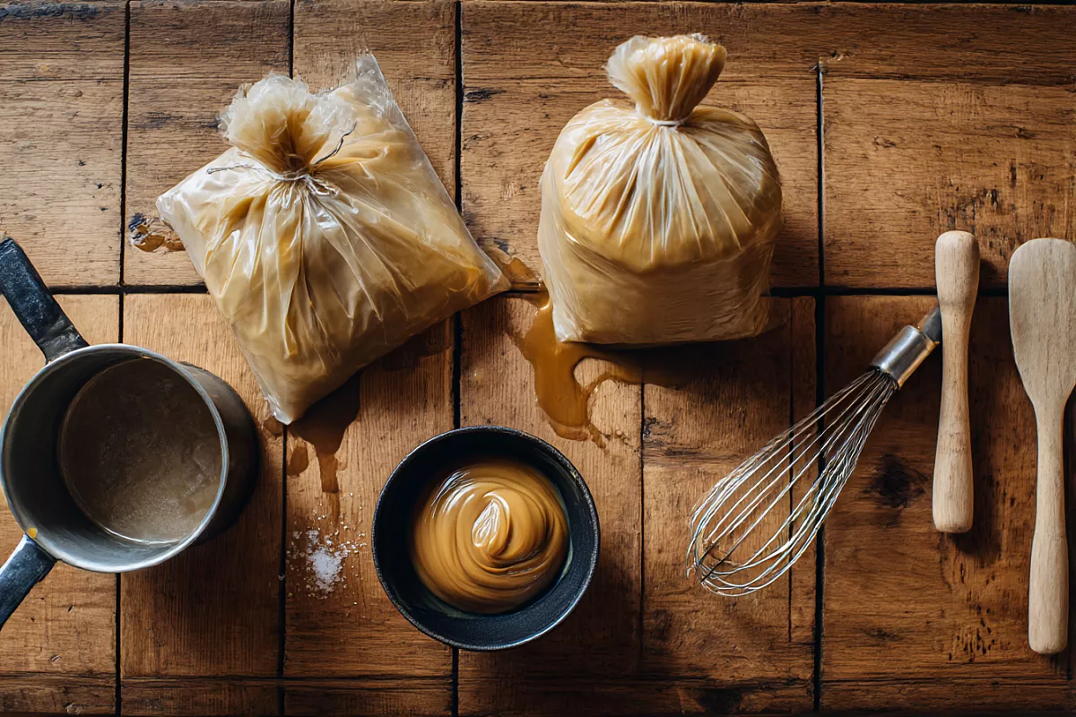 Готовую горячую карамель нельзя сразу класть в торты и десерты, она должна полностью остыть и стабилизироваться. Удобный способ – перелить её в кондитерский мешок, завязать и оставить до остывания. Так карамель не прилипает к стенкам миски и потом её легко использовать прямо из мешка.