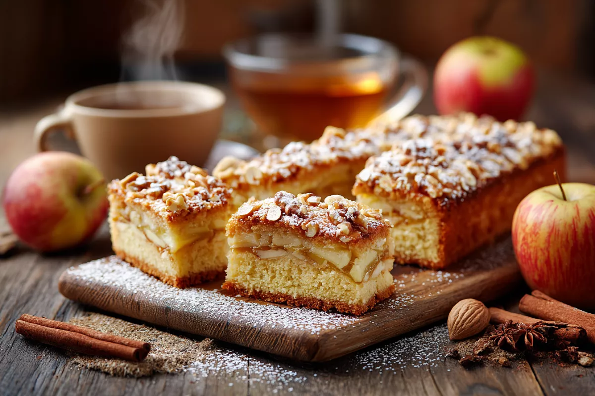 Яблочное пюре между двумя слоями воздушного теста пропитывает бисквит. Корица и орехи добавляют аромат.