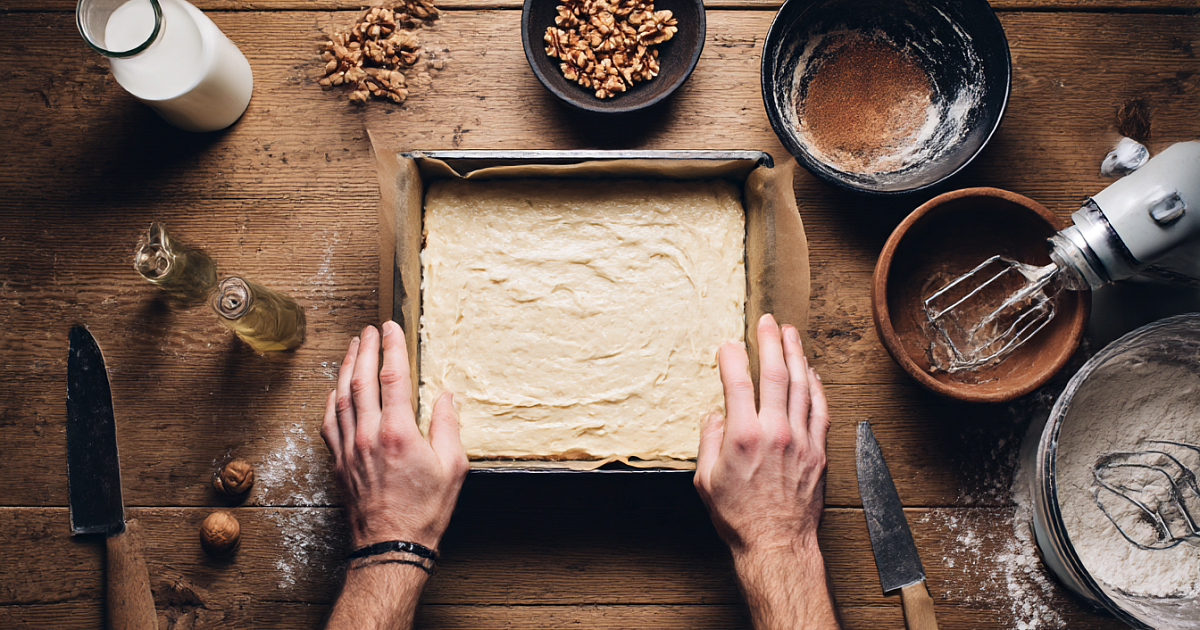 Форму размером около 25×35 см подготовьте заранее: застелите пергаментом или смажьте и слегка присыпьте мукой. Вылейте в форму примерно половину теста и равномерно распределите. Сверху осторожно разложите яблочное пюре, не перемешивая с нижним слоем, и слегка присыпьте корицей по вкусу.