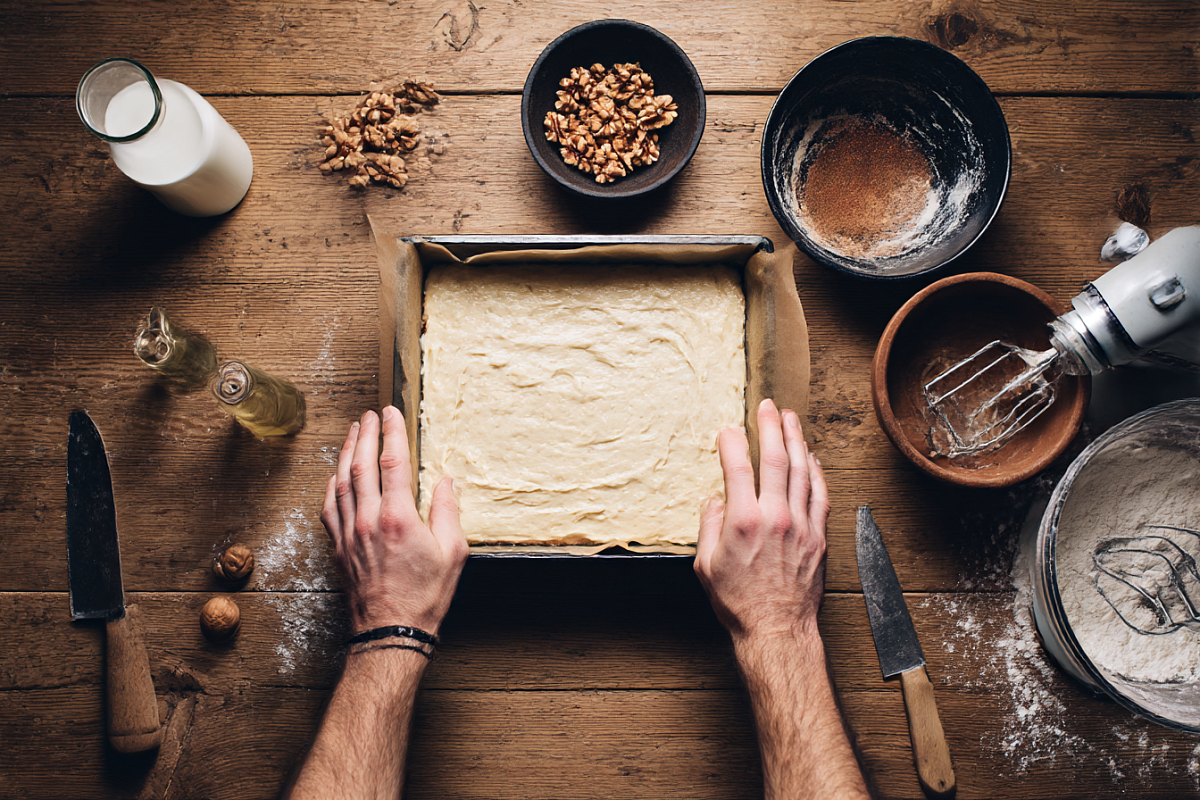 Муку заранее просейте, это важно и для структуры, и для удобства работы. Смешайте её с двумя чайными ложками разрыхлителя, можно добавить щепотку соли по вкусу. Сухую смесь порционно вводите в жидкую основу и аккуратно вмешивайте на небольшой скорости или лопаткой. После добавления муки долго не взбивайте, чтобы тесто не стало тягучим и тяжёлым.