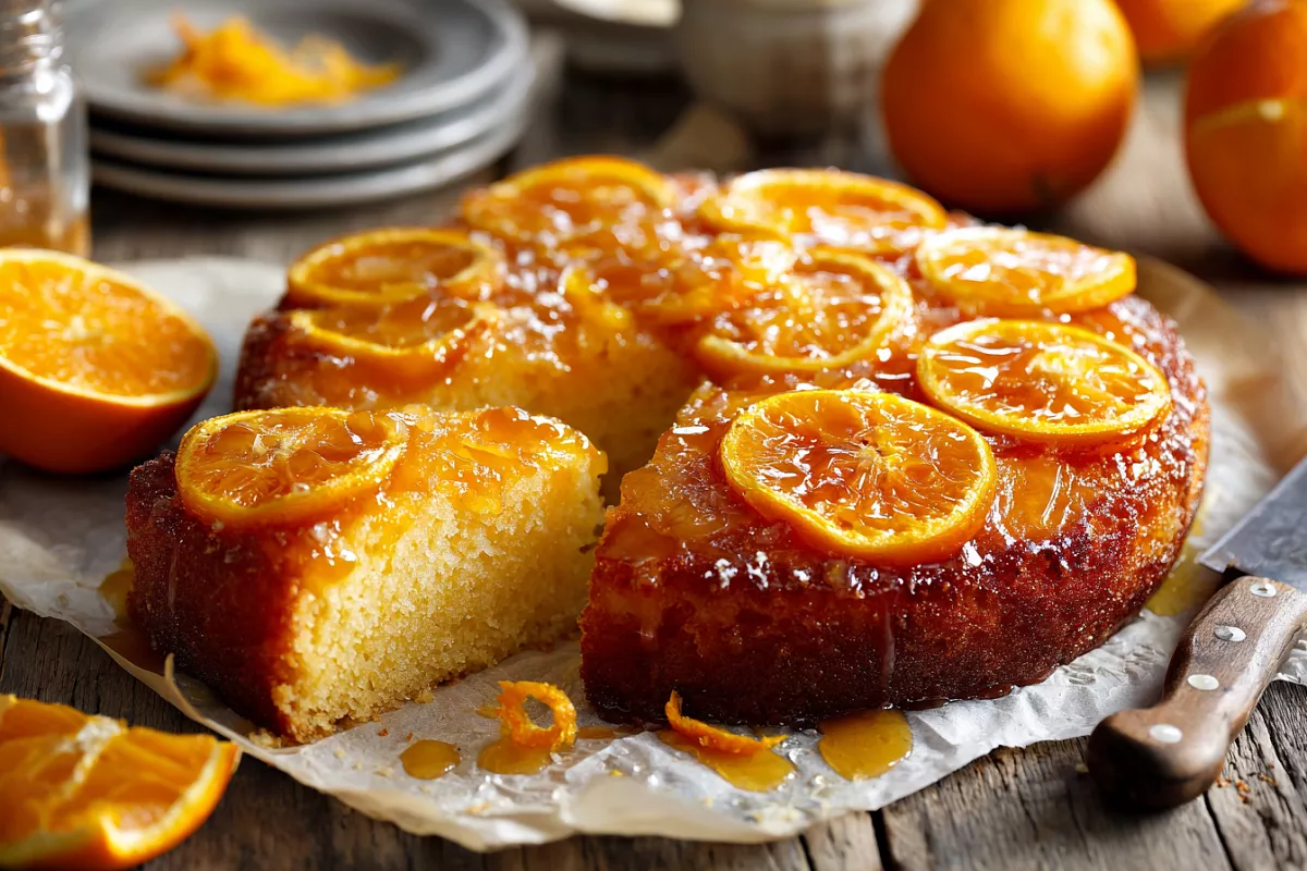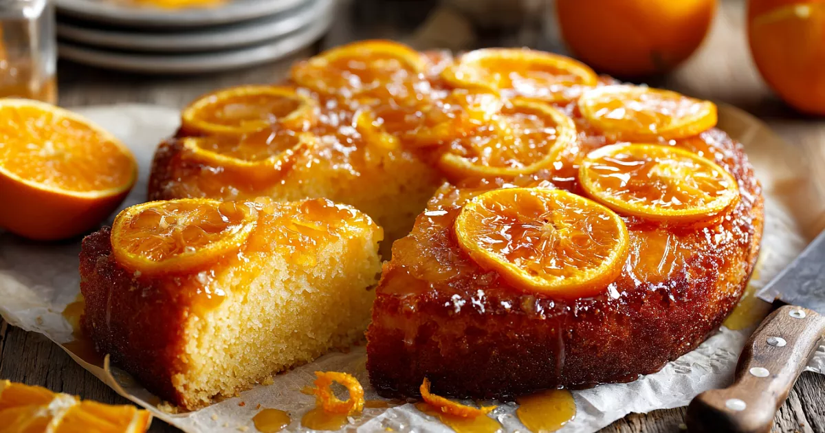 Апельсины на дне формы, тесто с соком и цедрой. Переворачиваем – джем сверху, бисквит пропитанный.