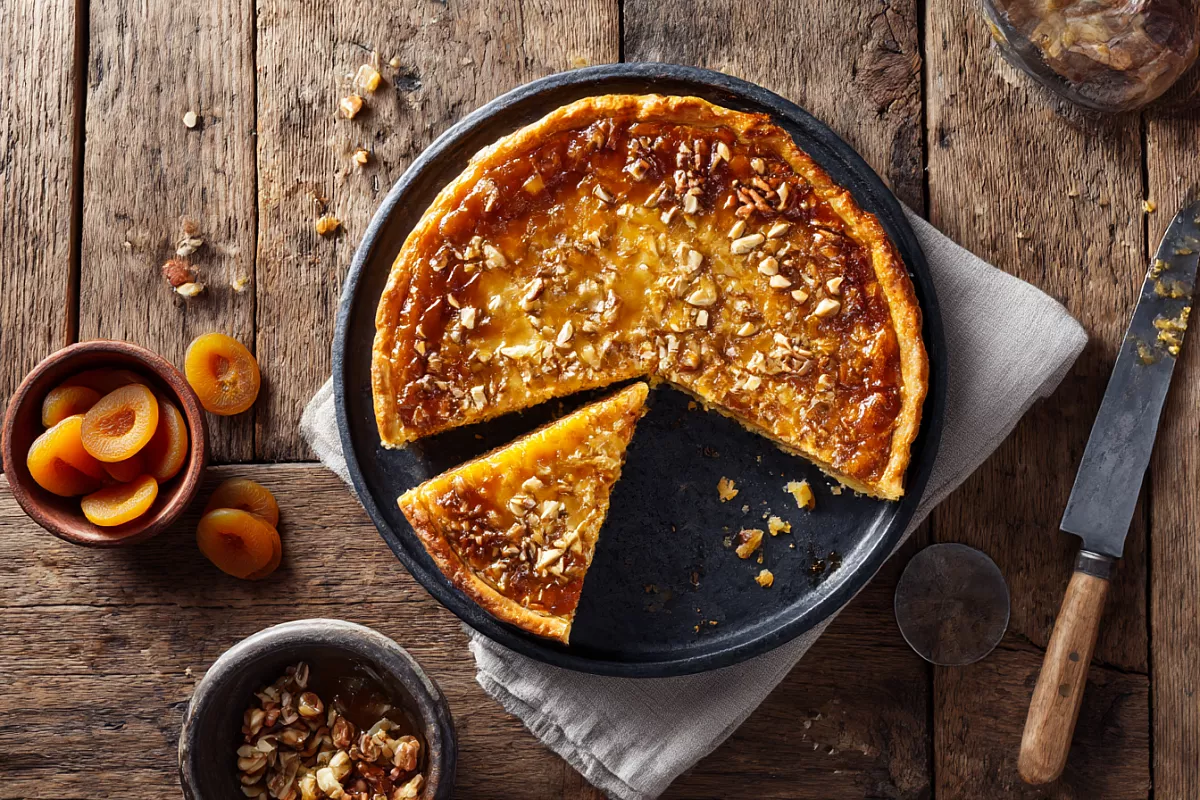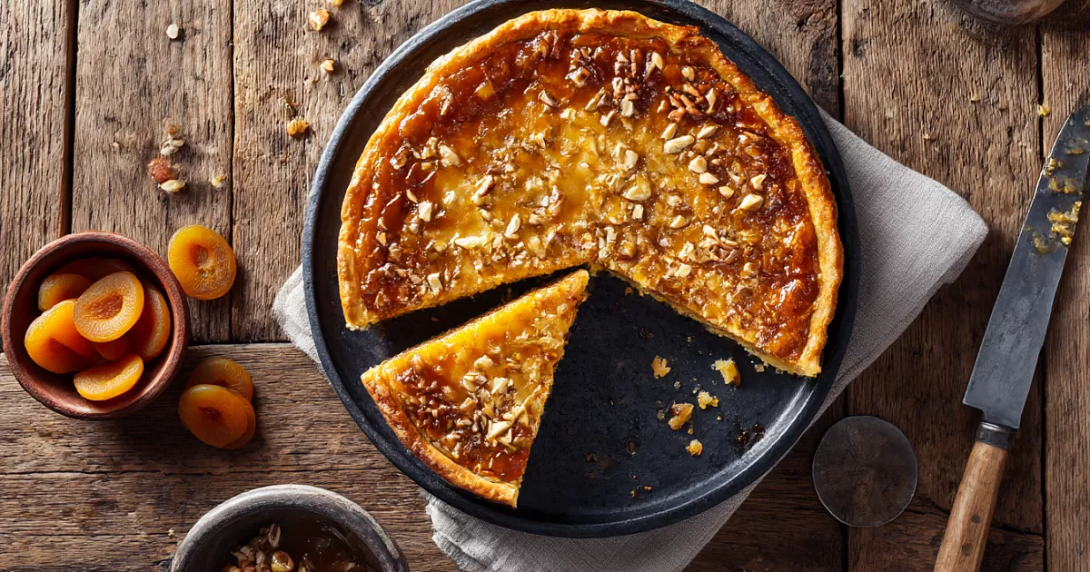 У этого пирога свой характер. Он считается национальной сладостью, родом из мест, где хорошо зреют абрикосы и орехи, и это чувствуется в каждом кусочке. Начинка здесь двойная: густой кураговый «джем» и сладковатая ореховая крошка, а тесто рассыпчатое, сливочное.