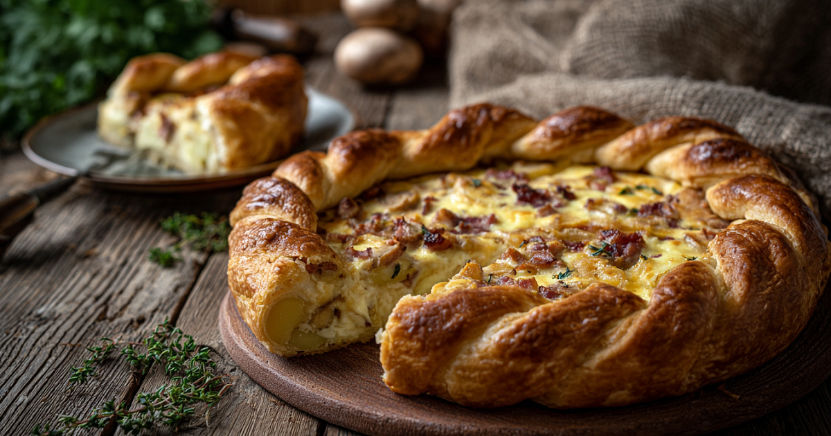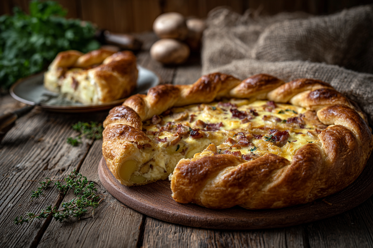 Картофельное тесто с дрожжами, грибная начинка с двумя видами грудинки, сметанная заливка – красота на праздничном столе.