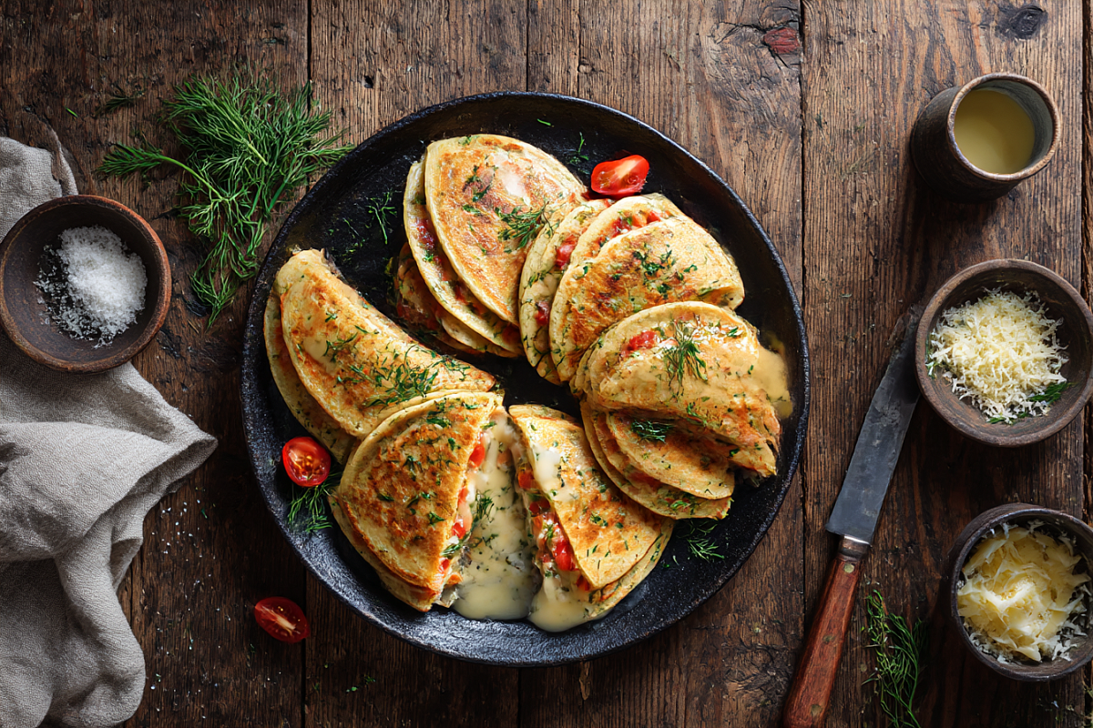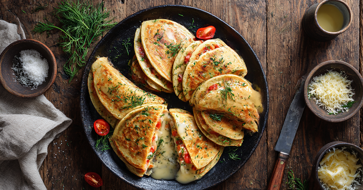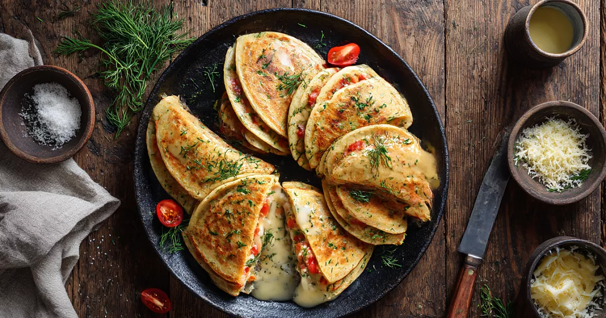 В этих блинчиках нравится всё: простое тесто, знакомый вкус и в то же время необычная начинка. Помидор и зелень дают свежесть, сыр внутри расплавляется и тянется, а сами блинчики выходят сытными, но не тяжёлыми. Выпекаются они так же легко, как обычные, а со стола исчезают очень быстро. Такой рецепт хорошо выручает, когда хочется чего-то домашнего и тёплого, но нет сил долго возиться у плиты.