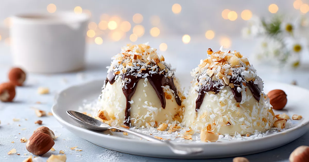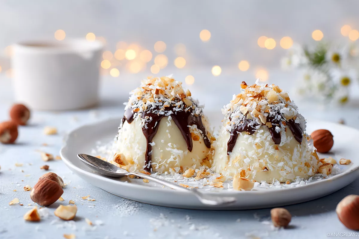 Посыпаем дно обжаренным молотым фундуком (или любыми орехами). Растапливаем 20 г молочного шоколада, поливаем верх – «кожа шапки». Обсыпаем кокосовой стружкой – «снег». Совет: стаканы не смазывать.