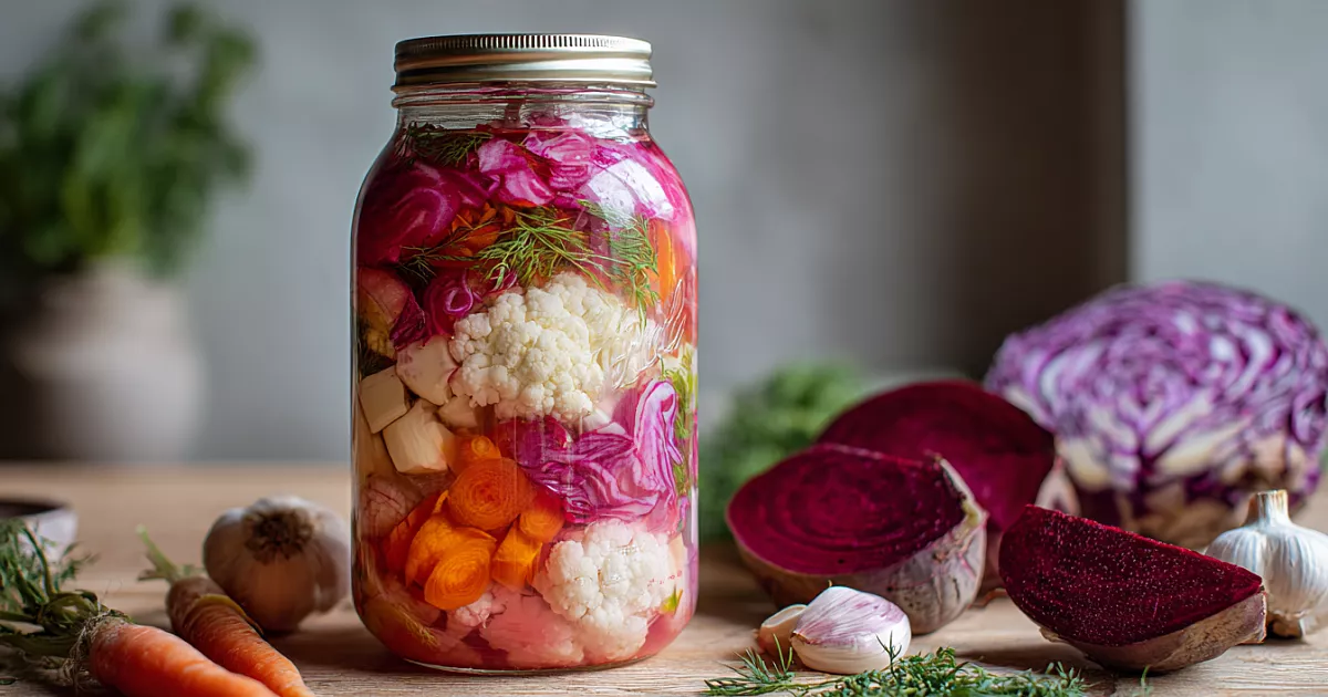 Белокочанная и цветная капуста, свекла, морковь, зелень, острый перец. Слоями в банку, заливаем тёплым рассолом – хрустящая, ароматная, с лёгкой остротой.