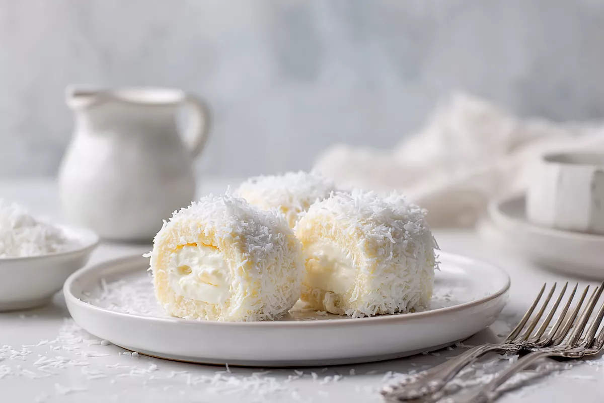 Наносим сливочный слой тонко по всей поверхности, слегка выходя за края. Разрезаем пласт пополам. Сворачиваем каждую половину в плотный рулет. Трещинки легко скрываем кокосовой стружкой.