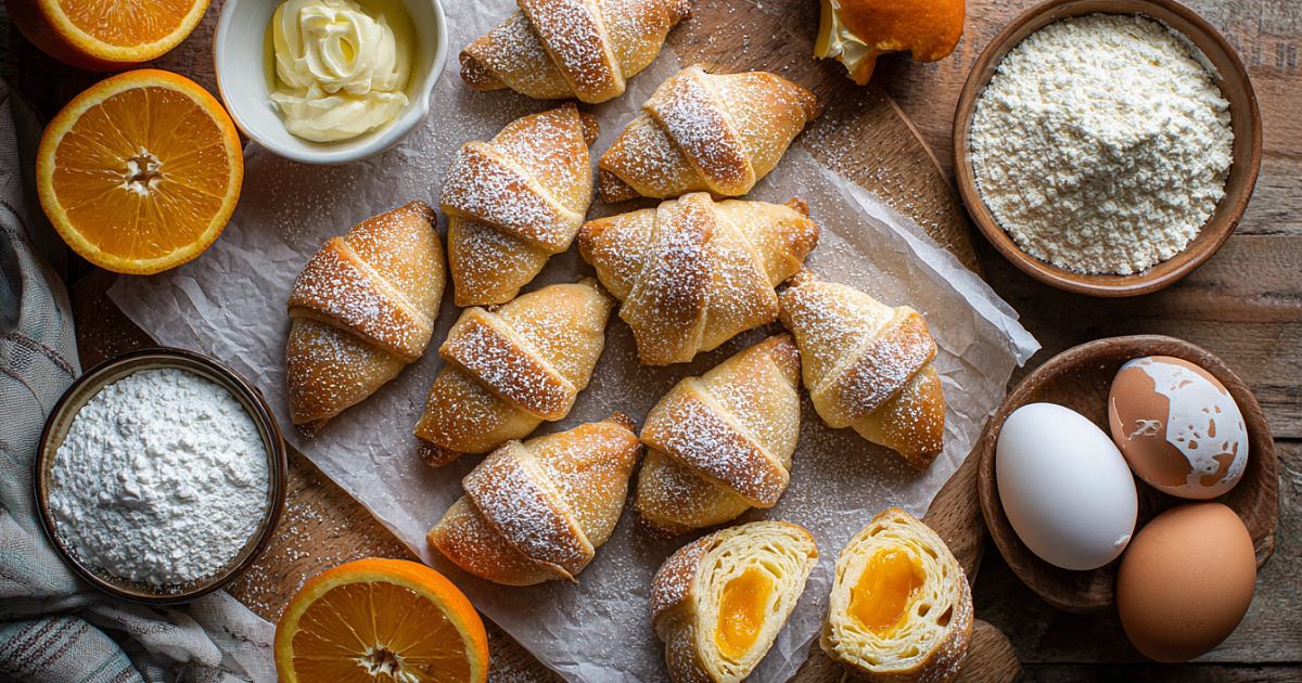 Делим холодное тесто на 4 части. Раскатываем каждую в круг 28–30 см на присыпанном мукой коврике. Режем на 8 треугольников. На широкий край кладём 0,5 ч. л. начинки полоской.