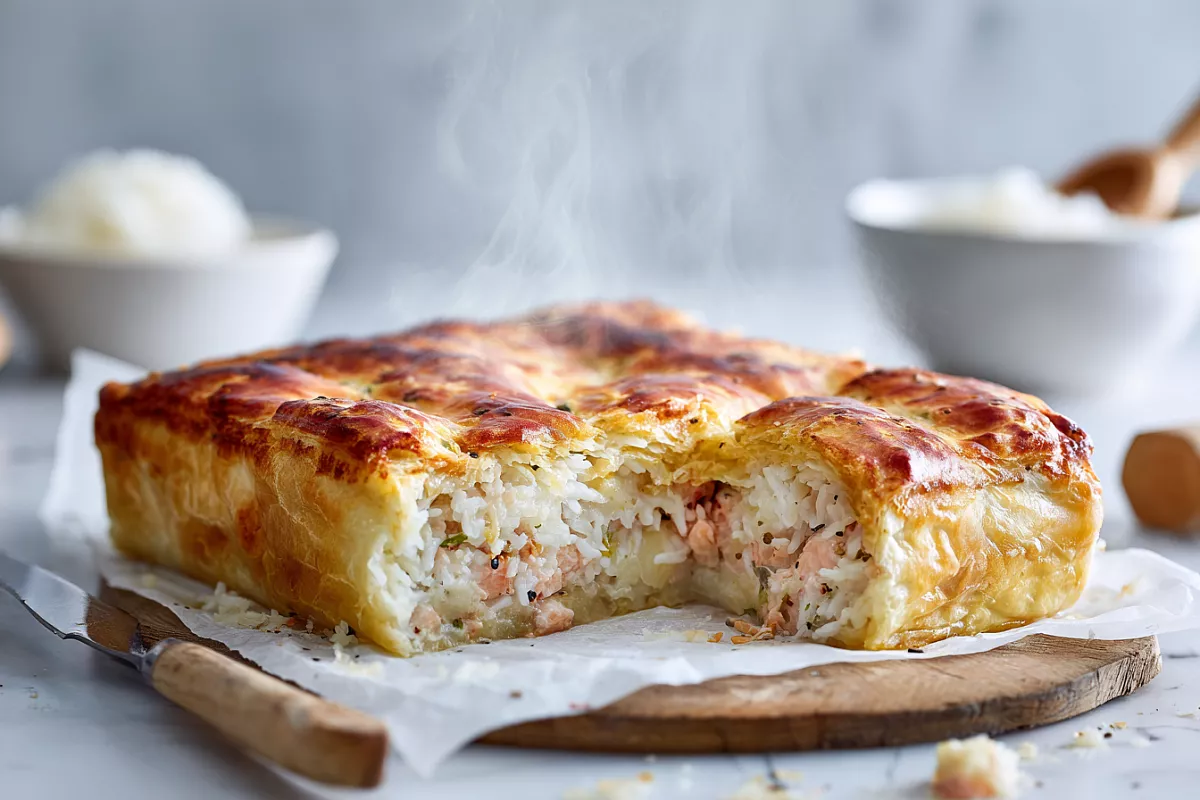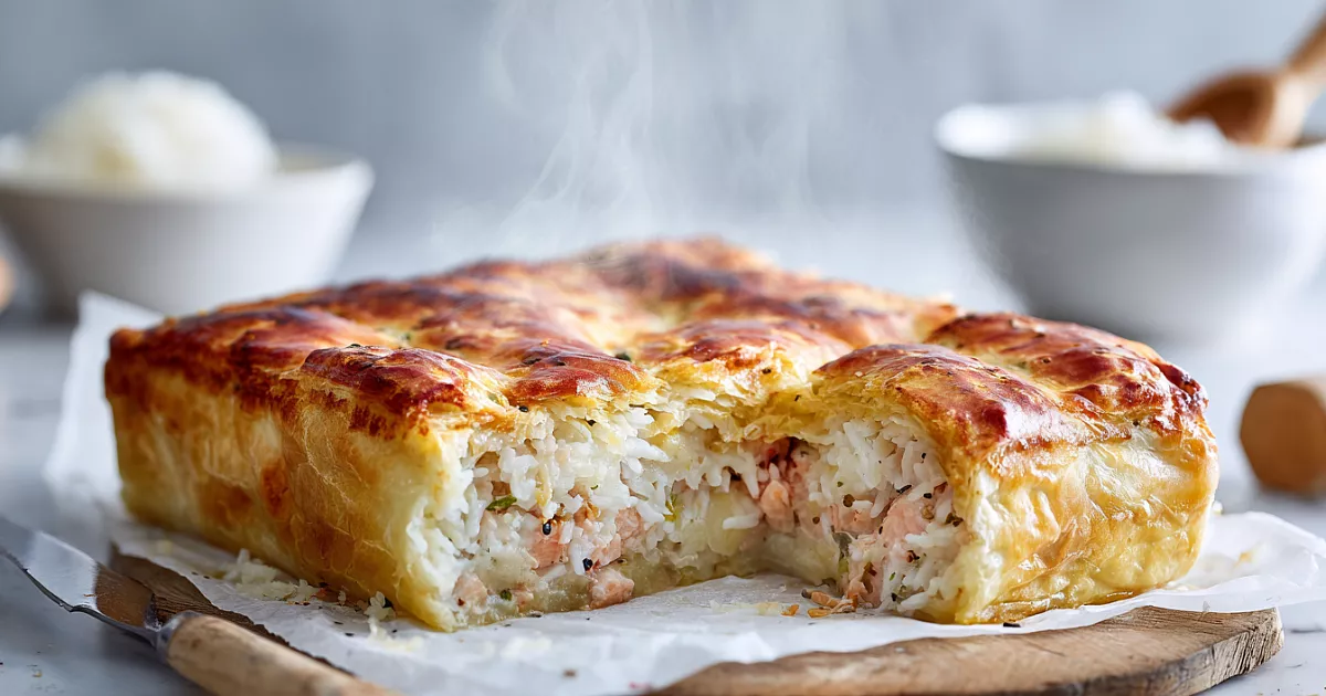 Домашний дрожжевой пирог с горбушей и рисом выпекается за полчаса. Тесто поднимается дважды, начинка остаётся влажной.