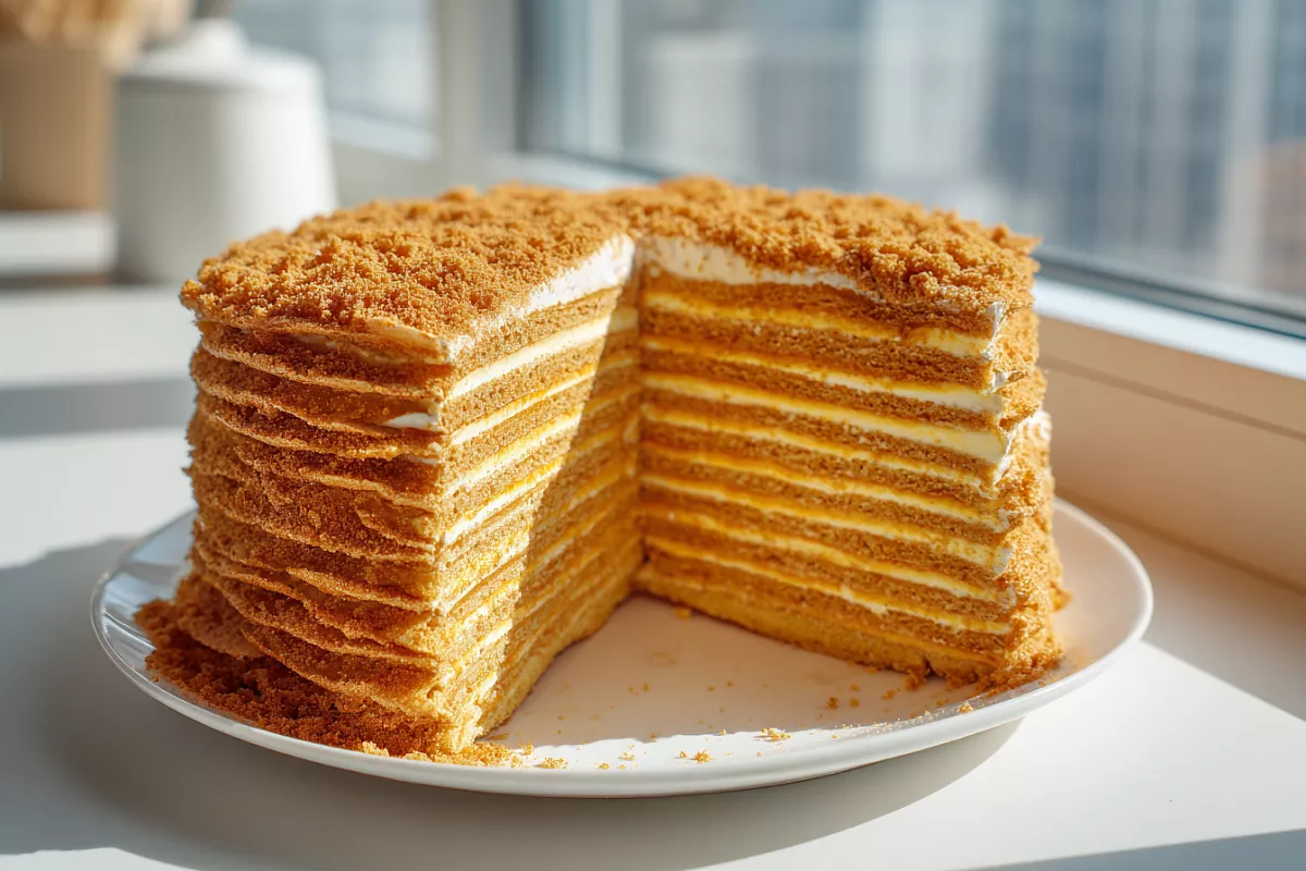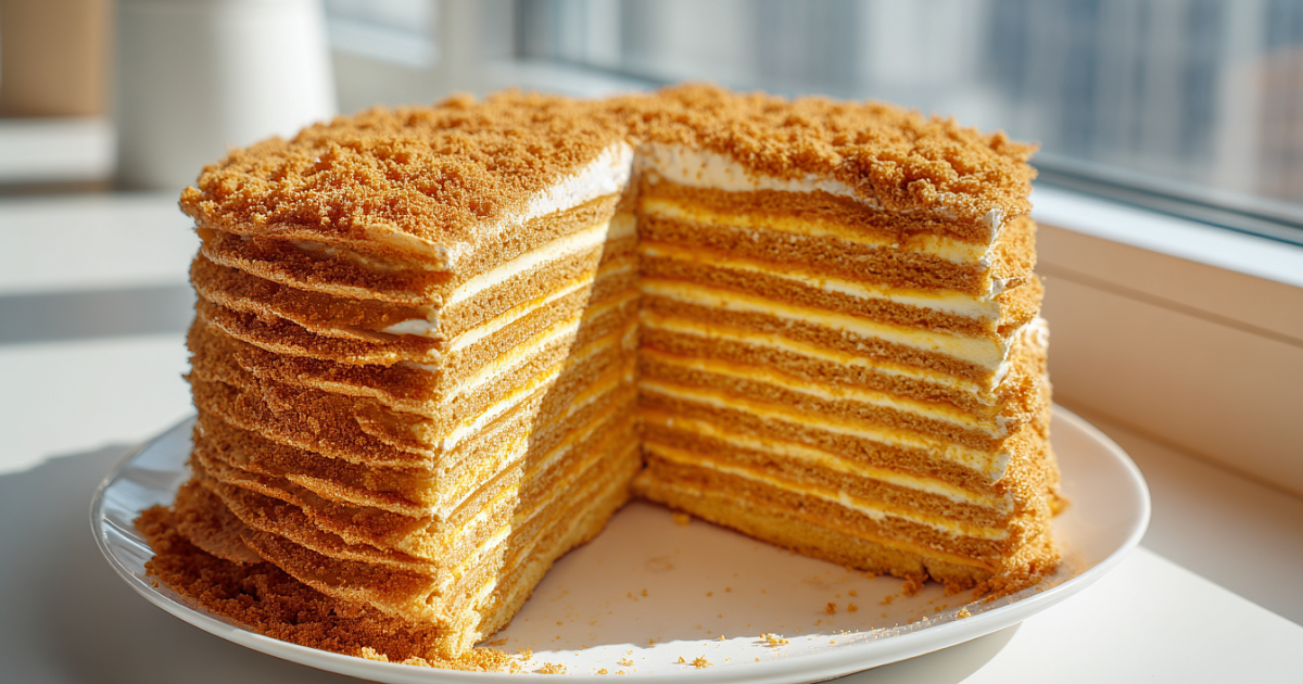 Пахнет карамелью, а не мёдом – после нагрева мёд становится сиропом. Коржи тающие.