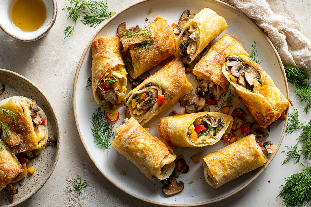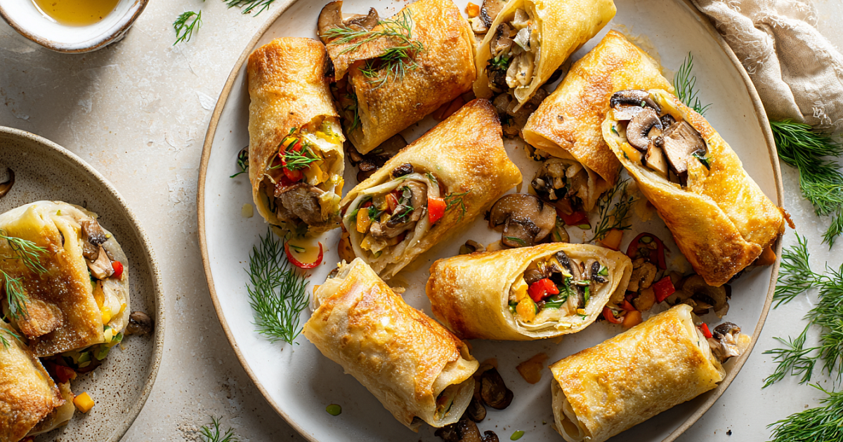 Шампиньоны, сыр и укроп в лаваше. Обжариваются в яйце с молоком – не жирные, но румяные.