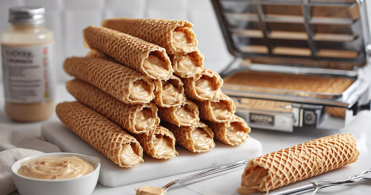 Закрываем, прижимаем. Печём 25–35 секунд до золотистости (ориентируемся по пару). Горячую вафлю снимаем лопаткой, сразу сворачиваем в трубочку конусом.