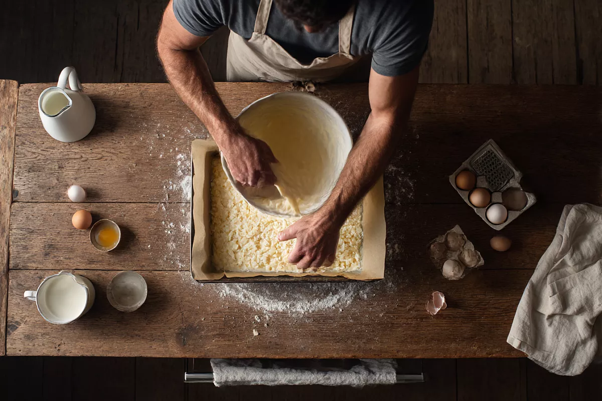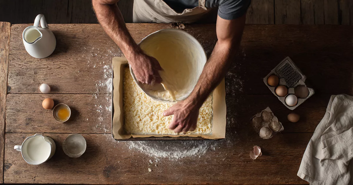 Шаг 1. Включите духовку и разогрейте её до 170 °C в стандартном режиме «верх-низ». Форму или противень застелите пергаментом так, чтобы образовались бортики, и отставьте в сторону.