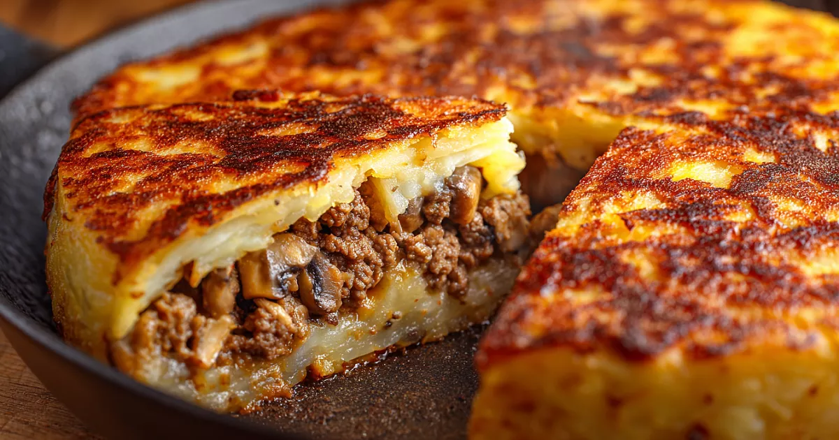 Ароматный пирог из тёртого картофеля с мясом и грибами готовится без духовки. Получается румяным и сочным за час.