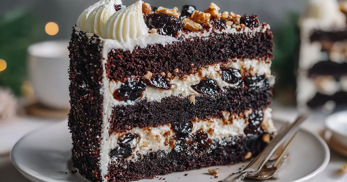 В кольце с плёнкой пропитываем корж сиропом. Крем. Половина орехов. Половина чернослива. Крем. Второй корж. Повтор. Третий. Тонкий крем. В холод на 4–7 ч.