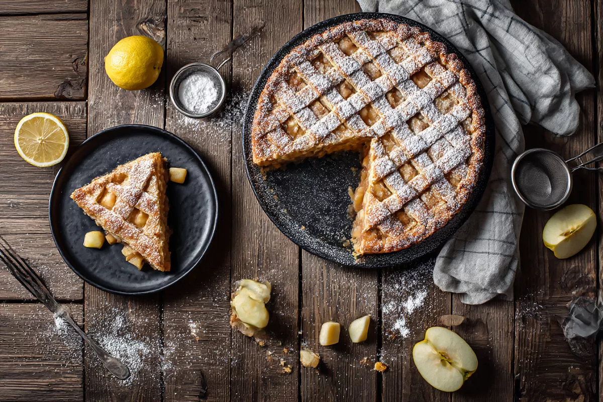 У этого пирога характер особенный: простое песочное тесто, много сочных яблок и та самая мягкая кислинка, которая делает первый кусочек запоминающимся. Рецепт легко держать в голове: по сто граммов сахара, сметаны и масла, плюс хорошая горка яблок. Внутри начинка получается почти мармеладной, тягучей, с лёгким ароматом лимона, а сверху — тонкий слой теста с бархатной корочкой, посыпанной сахарной пудрой.