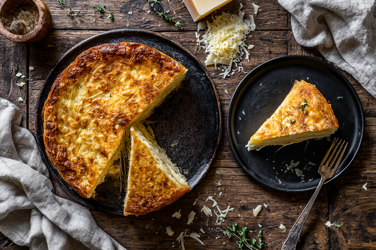 Шаг 7. Готовый пирог аккуратно выньте из формы. Подавайте в горячем виде, пока сыр мягкий и тянется, нарезав на порционные кусочки.