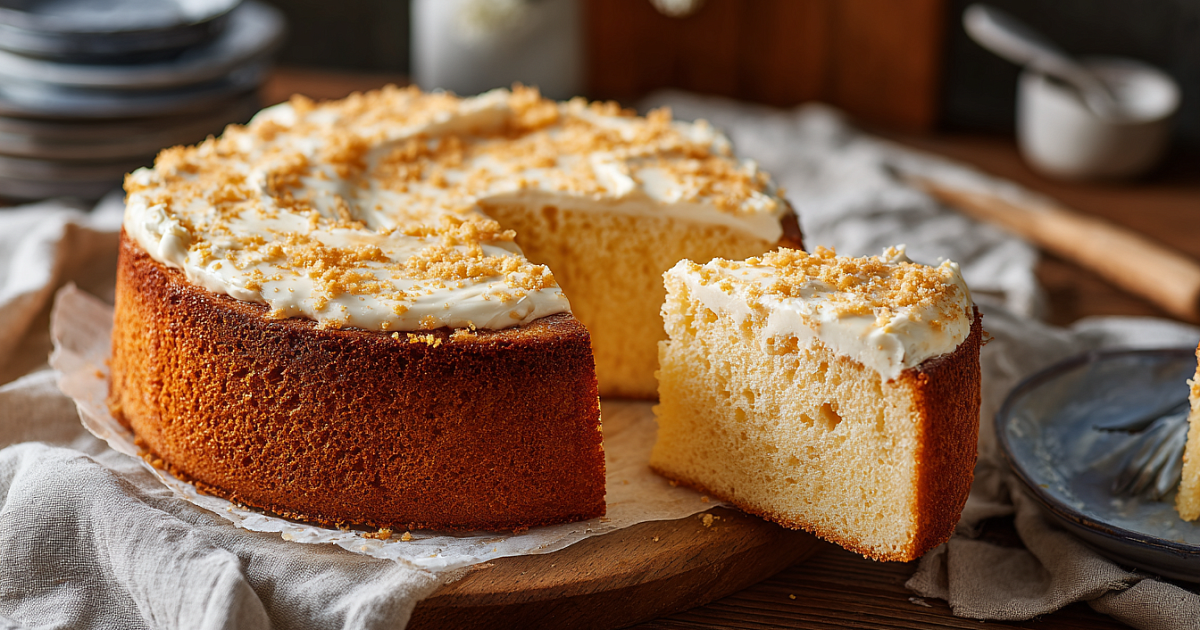 Готовим за 5 минут тесто, выливаем в форму и через 25 минут на столе ароматный высокий пирог! Сверху — сгущёнка и крошка, как в детстве.