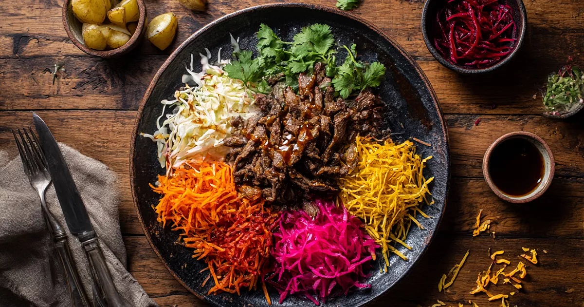 Шаг 9. Для подачи возьмите большое плоское блюдо. В центр выложите горку говяжьей соломки. Вокруг мяса отдельными кучками разложите капусту, морковь, свёклу, картофельную соломку и маринованный лук. При подаче посыпьте свежей кинзой.
