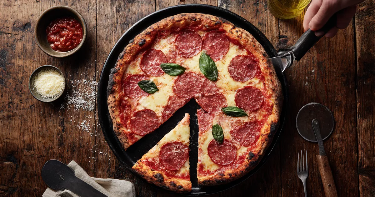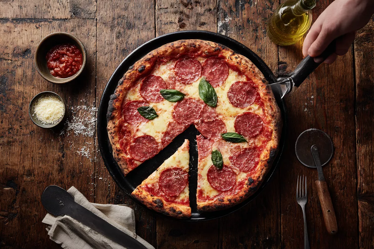 Этот рецепт проверен годами: тесто на дрожжах, но без лишних хлопот, легко вымешивается, хорошо поднимается и отлично тянется под руками. Основа получается тонкой, но не сухой, с упругой серединкой и хрустящими краями. Начинка может быть любой, но классическое сочетание томатного соуса, моцареллы, помидоров и салями всегда работает безотказно — и для семейного ужина, и для посиделок с друзьями.