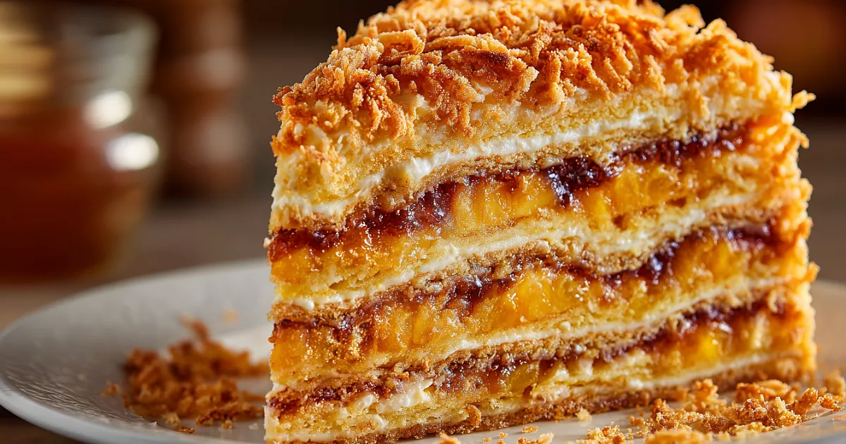 Второй кусок теста раскатываем так же, переносим на скалке и кладём сверху. Слегка прижимаем. Повторяем: ⅓ джема + 1½ натертого яблока.