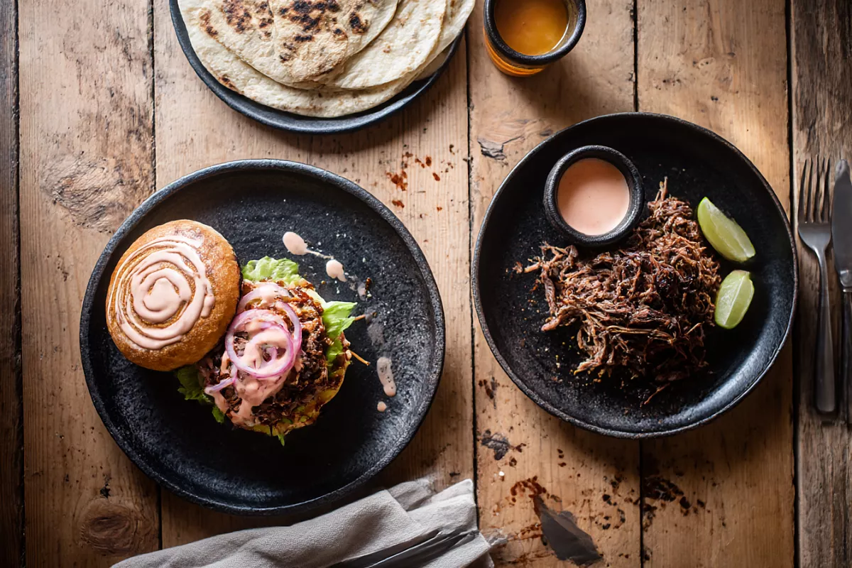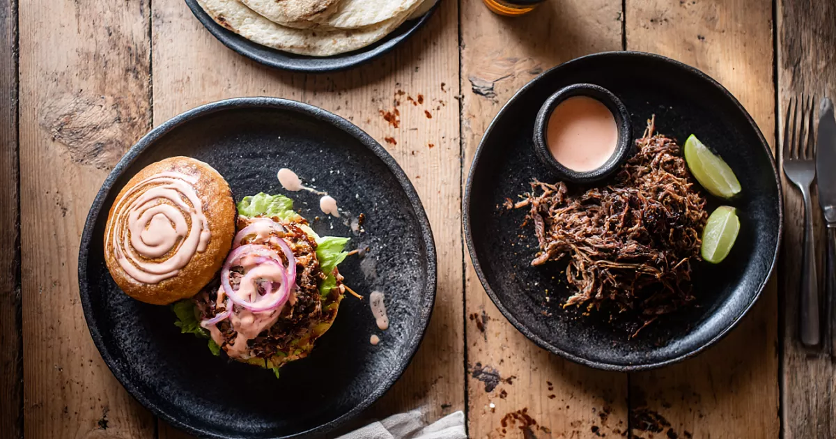Мясо медленно томится в духовке, становится таким мягким, что его можно разбирать вилкой и начинять бургеры, шаурму, блины или питы.
