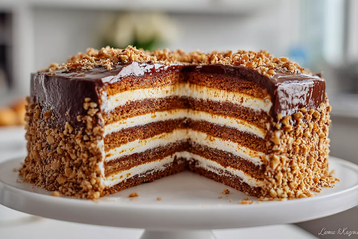 Верх и бока обмазываем оставшимся кремом. Бока обсыпаем дроблёными орехами, верх по желанию украшаем тёртым шоколадом или орехами.
