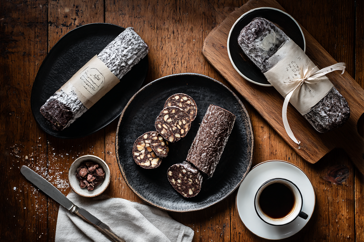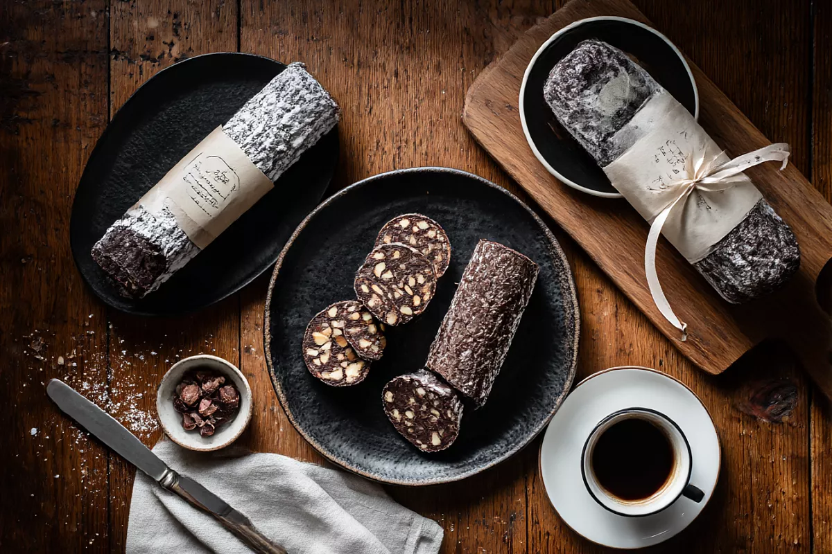 Сладкую колбаску многие помнят по детству: кусочки печенья вместо сала, орехи, запах какао и крепкий чай рядом. Хорошо, что этот десерт не потерял популярности, а рецептов стало даже больше. Можно сделать совсем простую колбаску, можно собрать более сливочный вариант, а можно устроить почти кондитерский эксперимент с шоколадом, фундуком и вяленой вишней.
