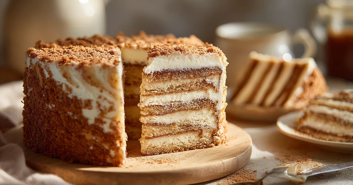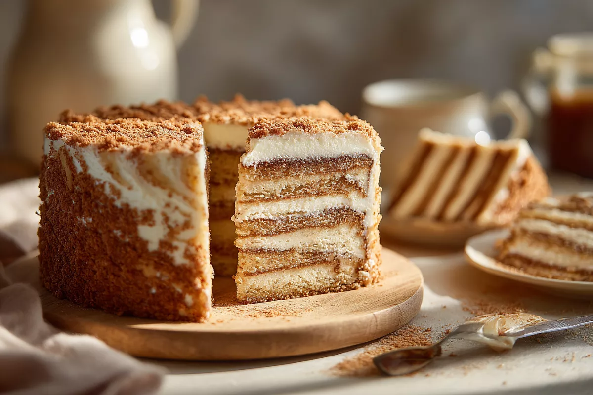 Коржи щедро промазывают кремом, собирают торт, обмазывают бока и верх. Обильно посыпают двухцветной крошкой из обрезков. Дают постоять хотя бы пару часов — будет ещё вкуснее.