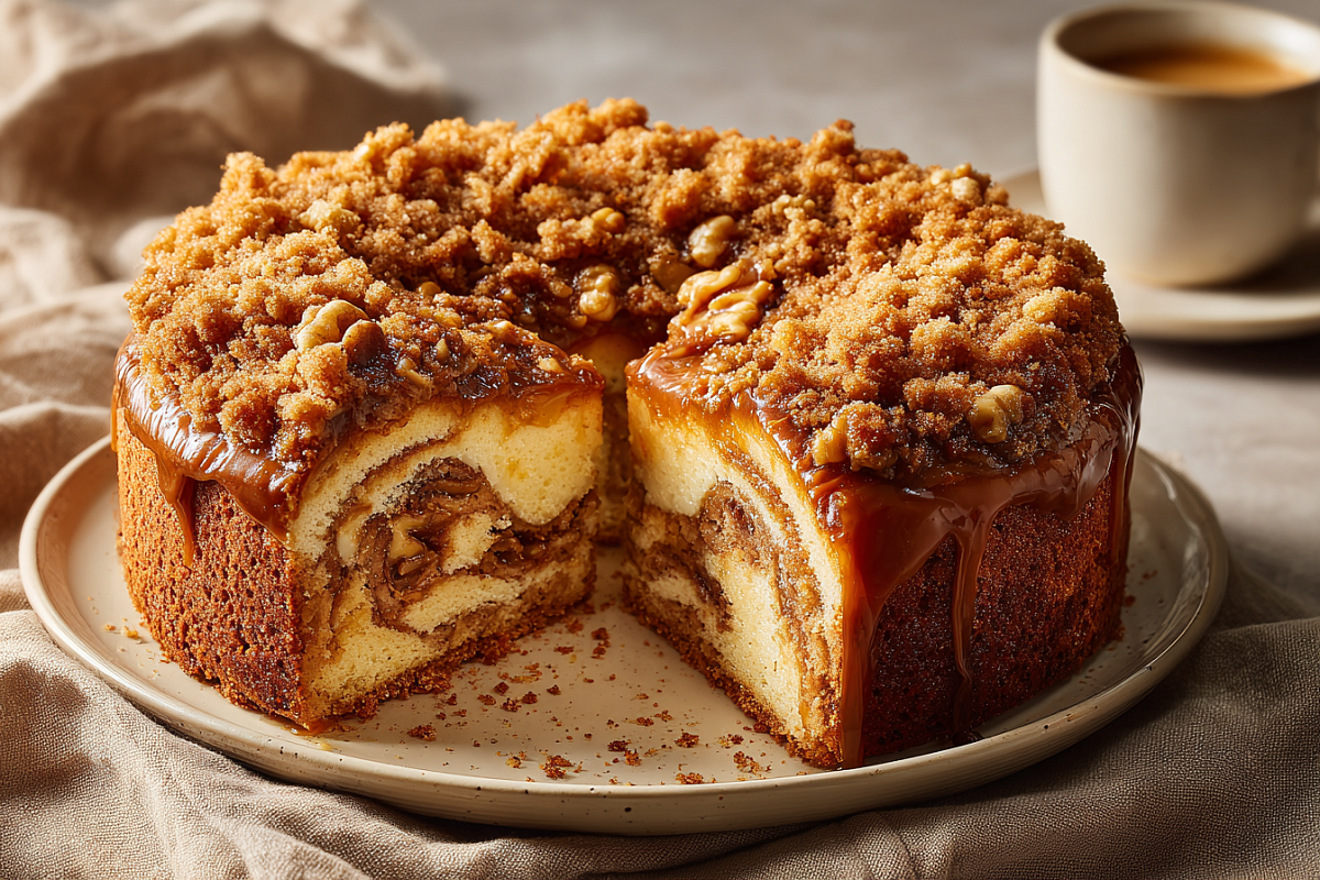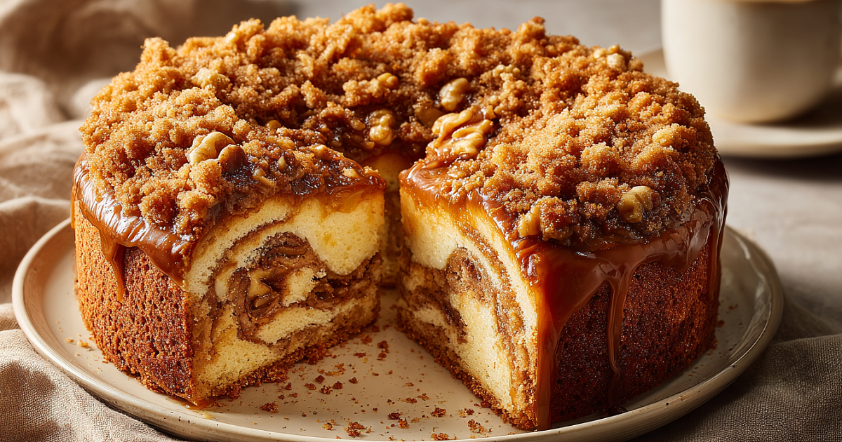 Нежное бисквитное тесто, тягуче-карамельная начинка с орехами и песочная крошка сверху — это тот самый пирог, который исчезает с тарелки за считанные минуты.