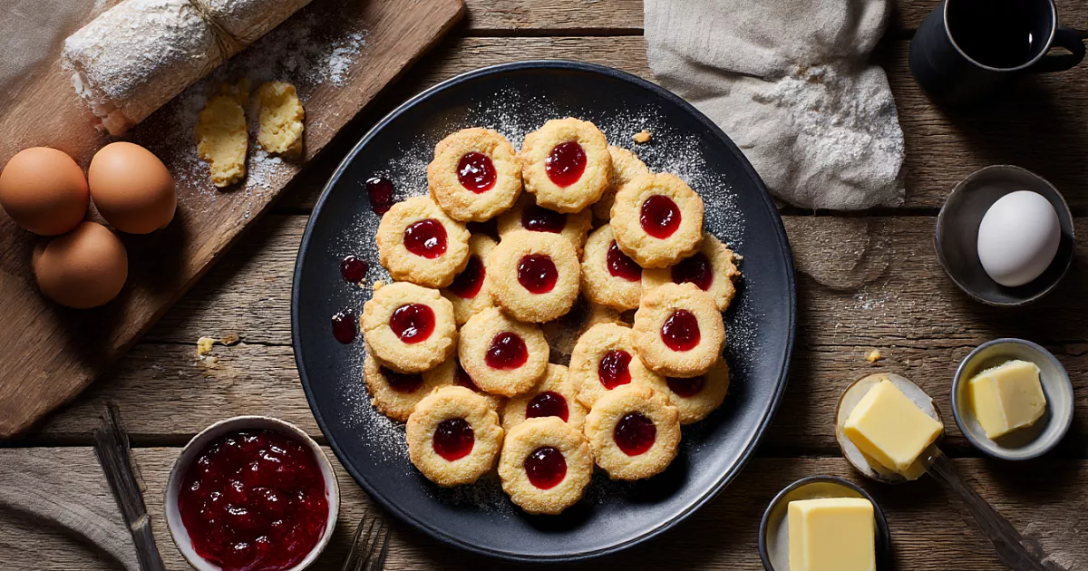 Хрупкое песочное печенье, мягкое запечённое марципановое кольцо и ложка кислого джема посередине — маленькое рождество в каждой штуке.