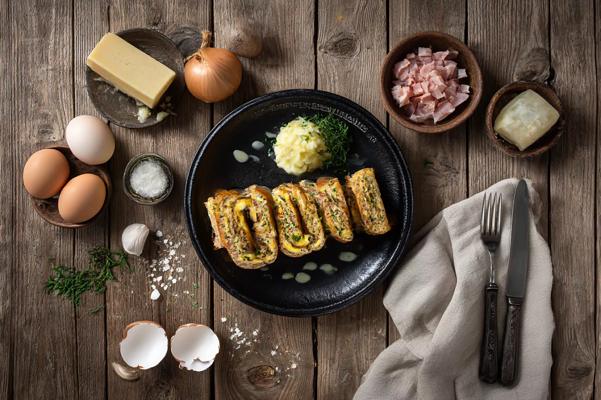Это очень сытное, домашнее блюдо, которое нравится и мужчинам, и детям. Здесь нет сложной запеканки или долгого стояния у плиты: тонкий «мясной блинчик», сверху чесночный соус, щедрый слой сыра и аккуратный рулет. Такие бризоли можно подать и к обычному ужину с пюрешкой, и на праздничный стол как горячую закуску — разрежьте рулеты порционными кусочками, и гости точно останутся довольны.