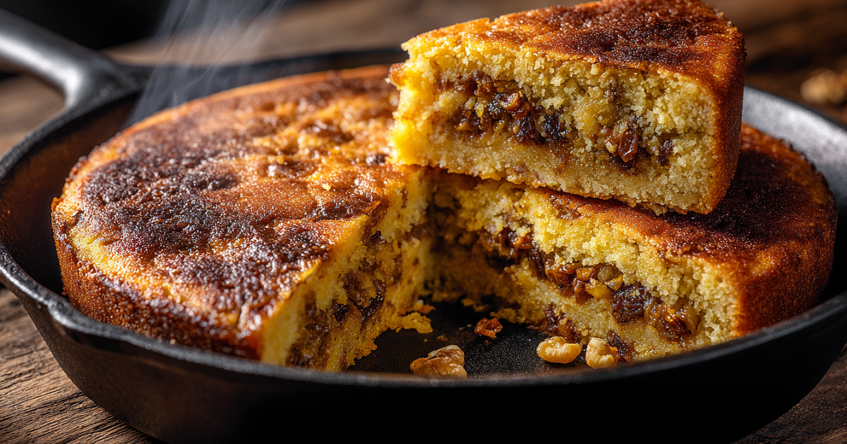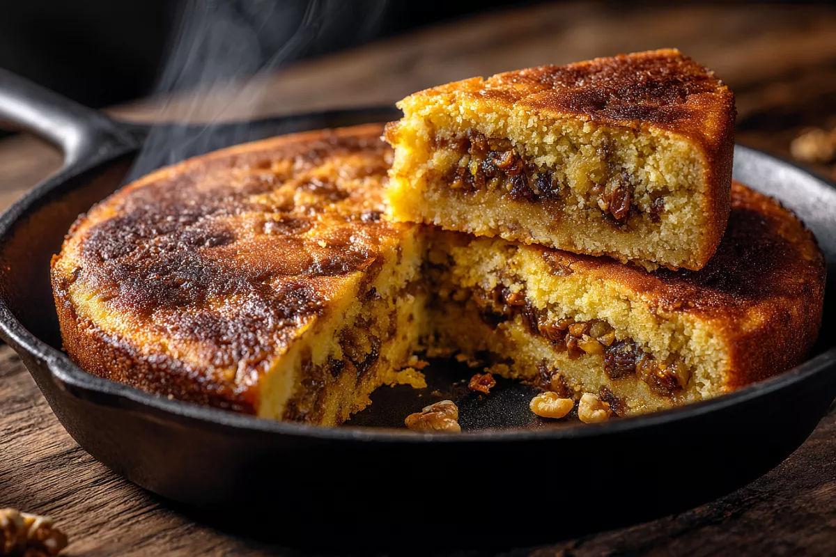 Тёплый пирог посыпаем сахарной пудрой. Тесто мягкое и сливочное, начинка насыщенно-сладкая с хрустом орехов — идеальный баланс!
