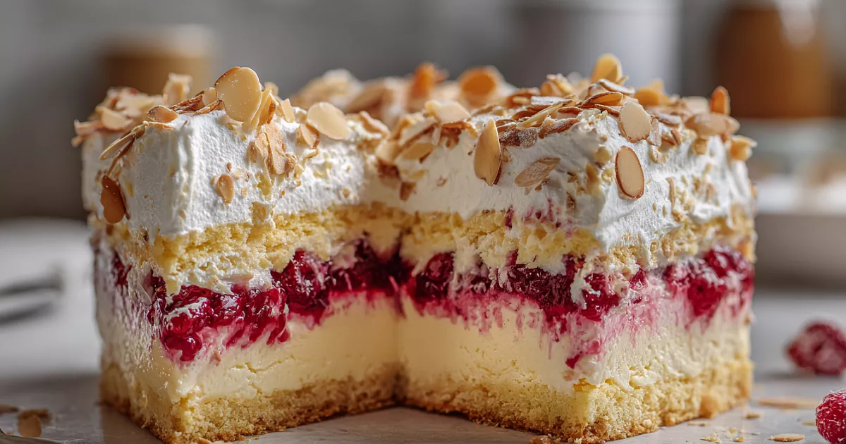 На подпечённый корж распределяют остывшую ягодную начинку. Сверху выкладывают меренгу, разравнивают и посыпают 80 г миндальных лепестков или рубленых орехов. Выпекают при 150 °C 30 минут до румяной корочки. Остужают полностью.