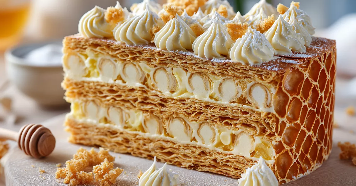 Лёгкие ажурные коржи из заварного теста и шёлковый заварной крем создают потрясающий разрез, похожий на пчелиные соты.