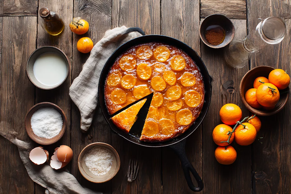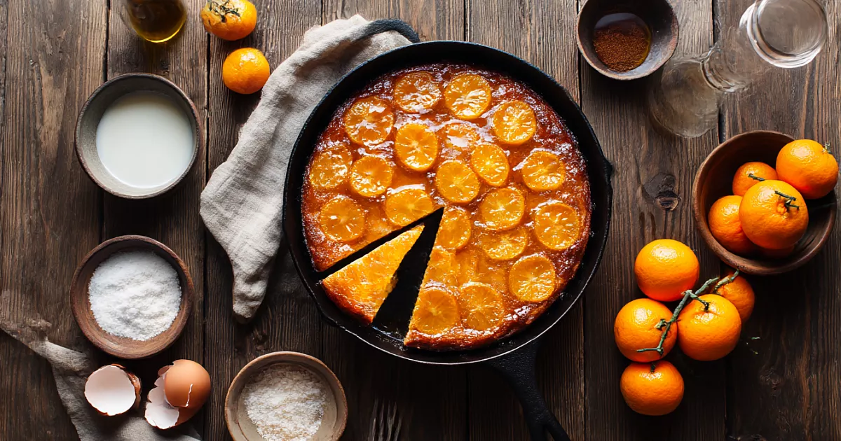 У этого пирога простой характер: минимум продуктов, одна сковорода и никаких сложных приёмов. Сладкая мандариновая корочка, мягкая цитрусовая серединка, сверху — нежное тесто. Подать его лучше всего с лимонадом из дикой вишни: лёгкая кислинка напитка подчёркивает аромат мандаринов и делает десерт по-настоящему особенным.