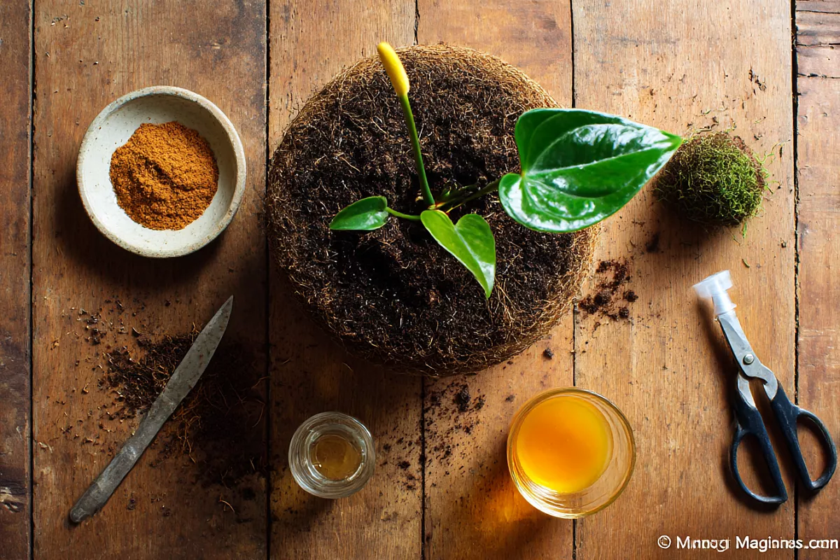 Поставьте антуриум в место без сквозняков, но с большим количеством рассеянного света. Следите за влажностью субстрата, избегая перелива. Остаток корично-медового раствора можно использовать для осторожного полива и опрыскивания других растений.