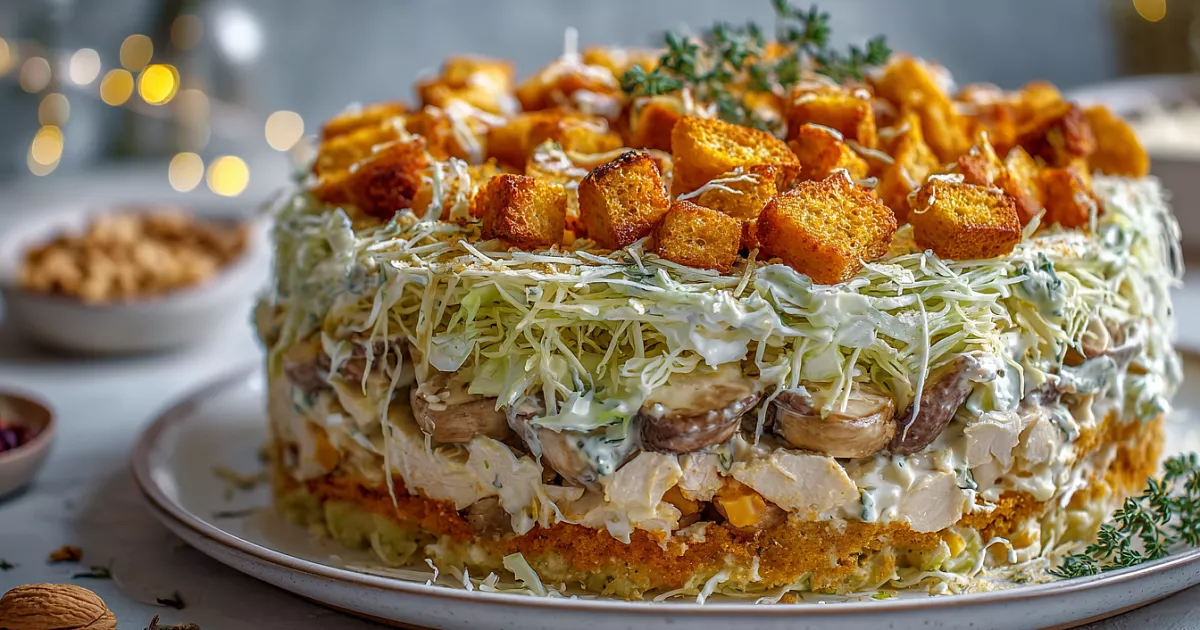 тонко нашинкованная пекинская капуста (слегка присаливаем) → обжаренные шампиньоны → сеточка из соуса → куриное филе → ещё немного пекинской капусты → сеточка соуса → щедрый слой тёртого твёрдого сыра → горка хрустящих сухариков (их добавляем прямо перед подачей).