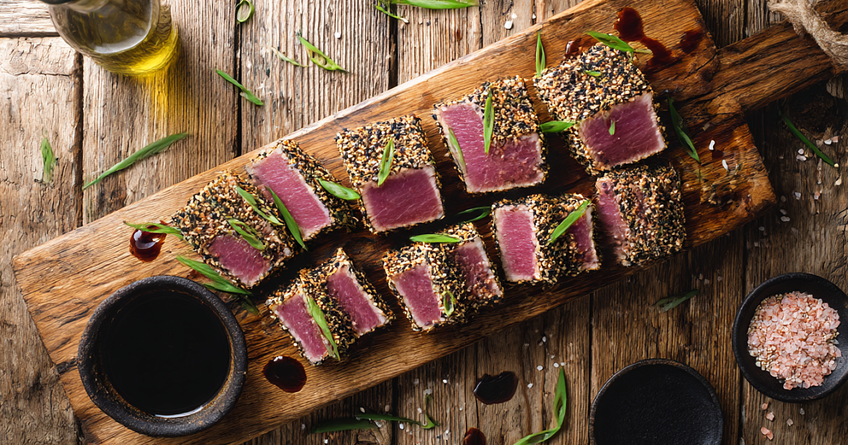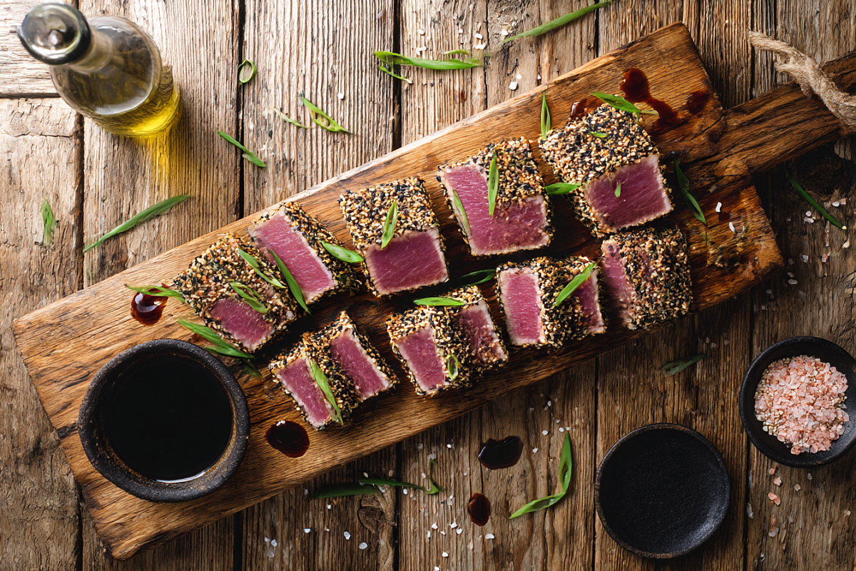 Всего несколько минут на сковороде-гриль — и на столе нежный тунец с хрустящей кунжутной корочкой.
